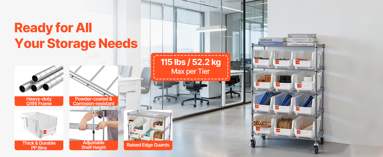 Každý regál na organizovanie zásobníkov unesie až 115 lb (52,2 kg) na isté každodenné používanie. Práškovo lakovaný rám Q195 odoláva opotrebovaniu, zatiaľ čo robustné koše z PP a vyvýšené koľajničky pomáhajú udržať predmety presne tam, kde ich chcete mať.