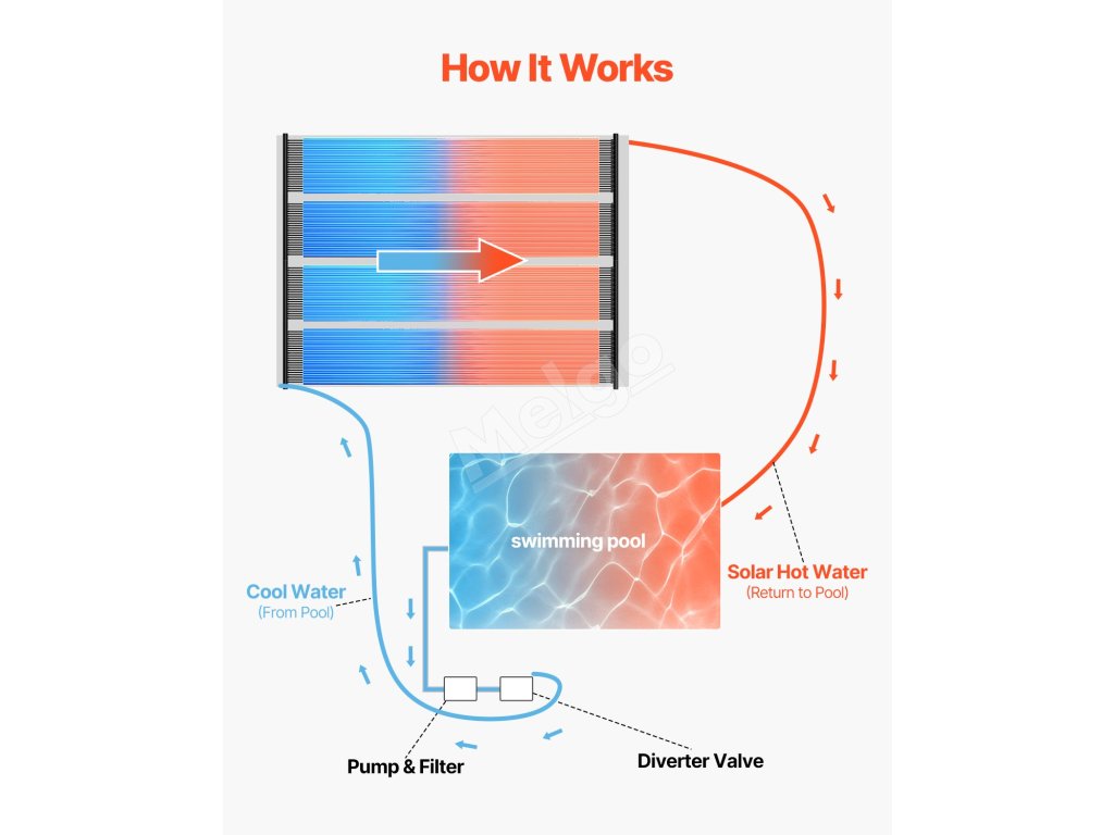 Využívanie nášho solárneho ohrevu bazéna na ohrev bazéna znižuje spotrebu energie a náklady na elektrinu. Naše solárne ohrievače bazénov maximálne využívajú slnečné žiarenie na rýchle zvýšenie teploty vody, čím predlžujú sezónu kúpania.