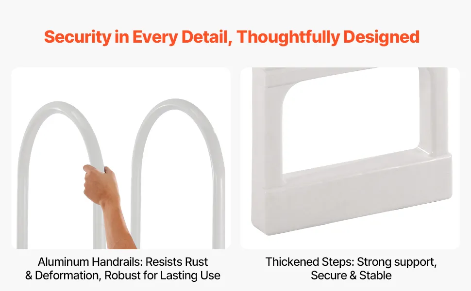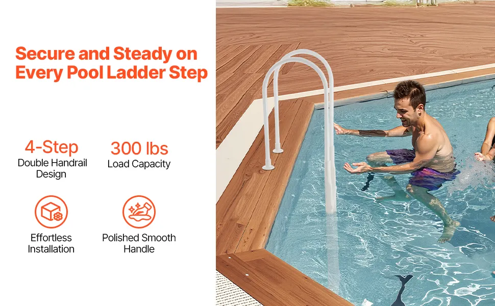 Náš 4-stupňový bazénový rebrík s dvojitým zábradlím ponúka stabilný a bezpečný vstup a výstup. Unesie až 300 lb a je vhodný pre všetkých používateľov. Inštalácia je jednoduchá a zábradlia zaisťujú pevné uchopenie. Vďaka dlhotrvajúcej stabilite je rebrík ideálny pre vnútorné aj vonkajšie bazény.