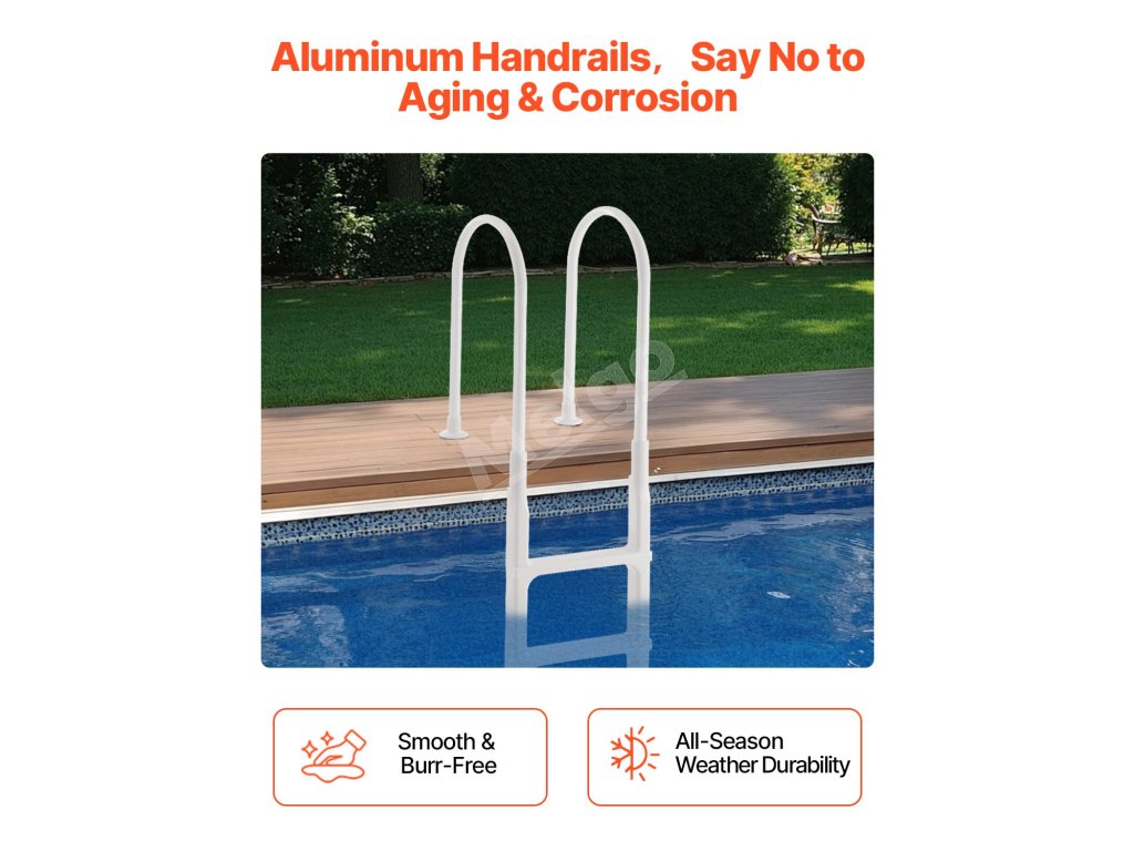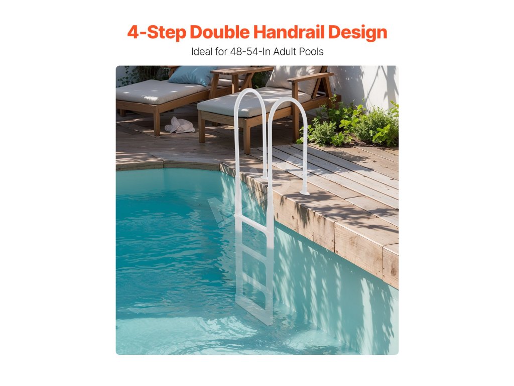 Náš 4-stupňový bazénový rebrík s dvojitým zábradlím ponúka stabilný a bezpečný vstup a výstup. Unesie až 300 lb a je vhodný pre všetkých používateľov. Inštalácia je jednoduchá a zábradlia zaisťujú pevné uchopenie. Vďaka dlhotrvajúcej stabilite je rebrík ideálny pre vnútorné aj vonkajšie bazény.
