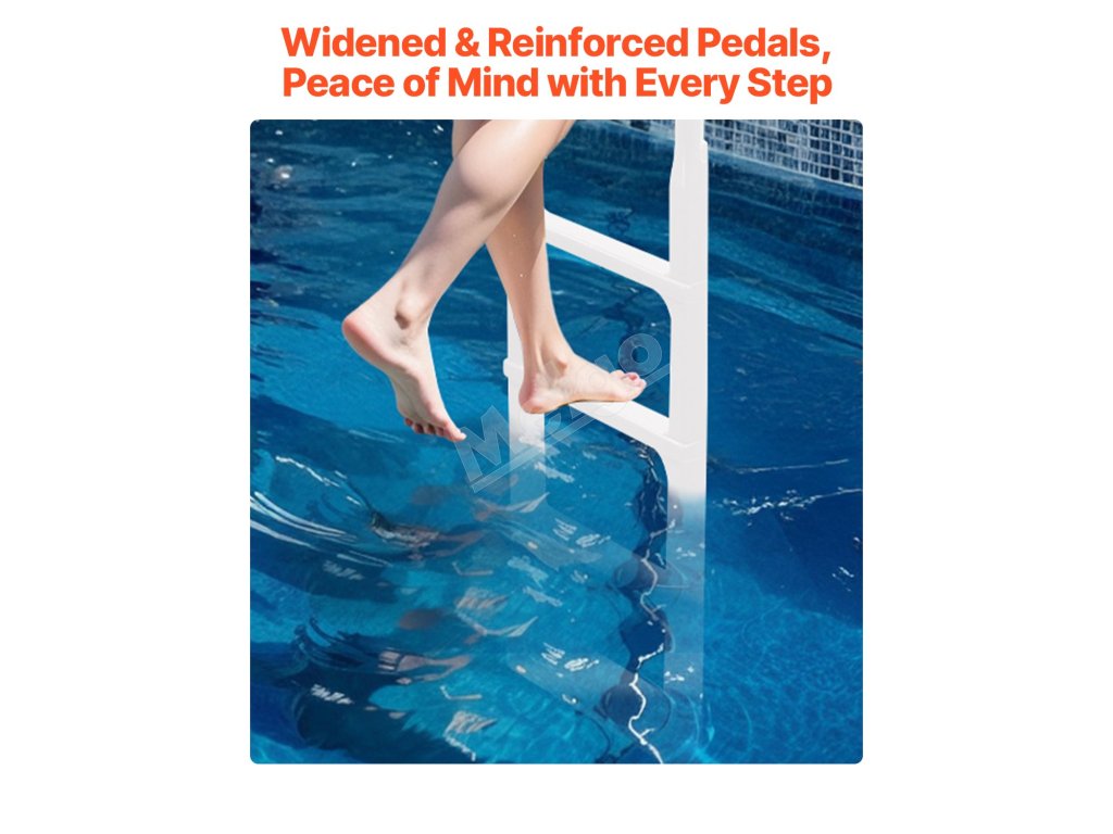 Náš bazénový rebrík sa dodáva s prírubovým montážnym príslušenstvom. Postupne zhrubnuté stupne zabezpečujú bezpečný vstup a výstup a pomáhajú predchádzať pošmyknutiam a pádom.