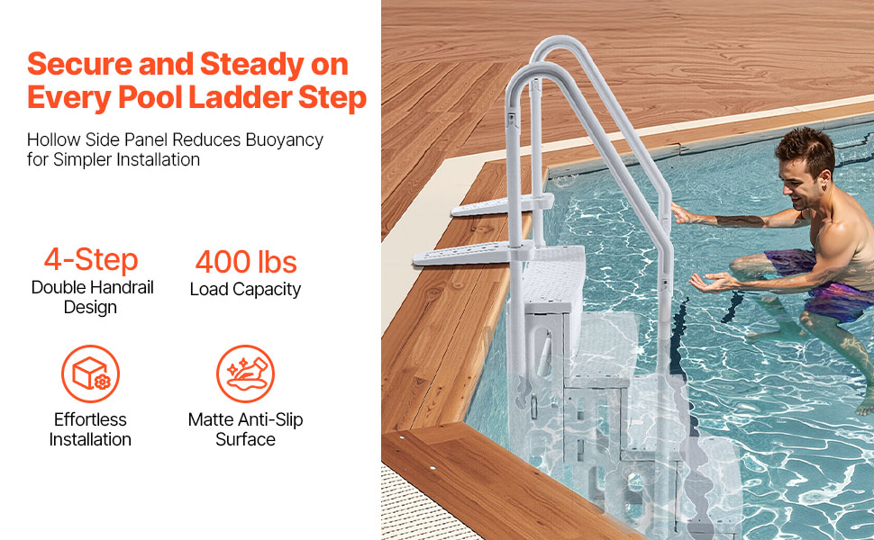 Náš 4-stupňový bazénový rebrík s dvojitým zábradlím ponúka stabilný a bezpečný vstup a výstup z bazéna. Vďaka nosnosti do 400 kg je vhodný pre používateľov všetkých veľkostí. Inštalácia je jednoduchá a hladké zábradlia zaisťujú pevné uchopenie. Vďaka dlhotrvajúcej stabilite je tento rebrík istý pre vnútorné aj vonkajšie bazény.