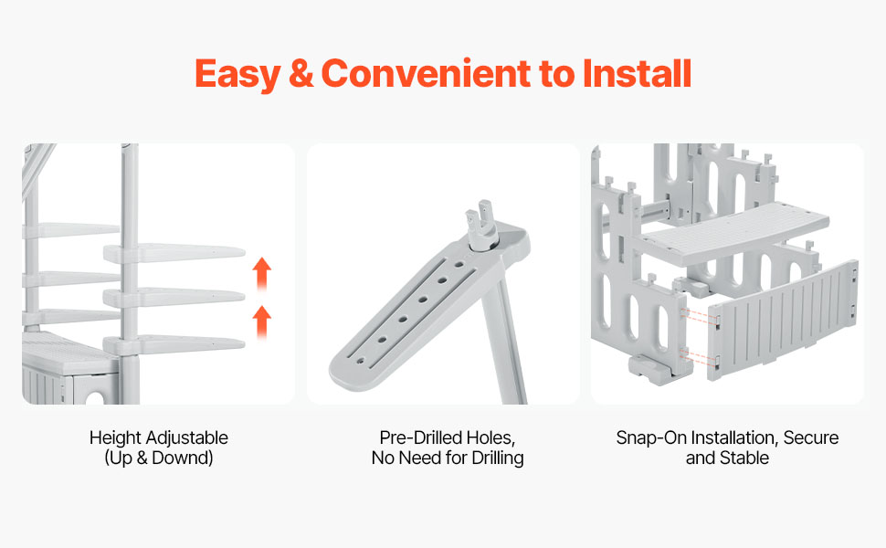 Tento rebrík, vybavený panelmi s nastaviteľnou výškou a predvŕtanými otvormi, umožňuje rýchlu a jednoduchú inštaláciu. Stačí postupovať podľa pokynov, môžete ho nainštalovať do svojho bazéna rovnako ako profesionál a začať ho ihneď používať!