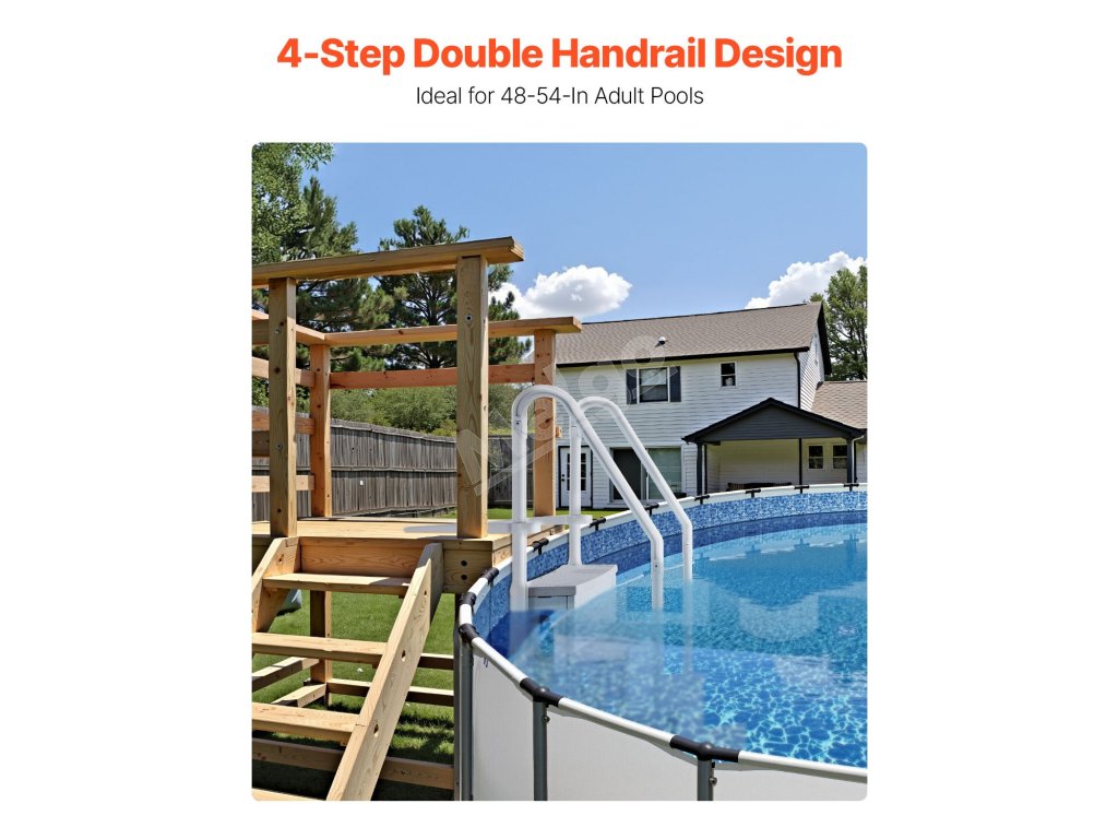 Náš 4-stupňový bazénový rebrík s dvojitým zábradlím ponúka stabilný a bezpečný vstup a výstup z bazéna. Vďaka nosnosti do 400 kg je vhodný pre používateľov všetkých veľkostí. Inštalácia je jednoduchá a hladké zábradlia zaisťujú pevné uchopenie. Vďaka dlhotrvajúcej stabilite je tento rebrík istý pre vnútorné aj vonkajšie bazény.