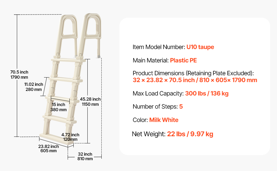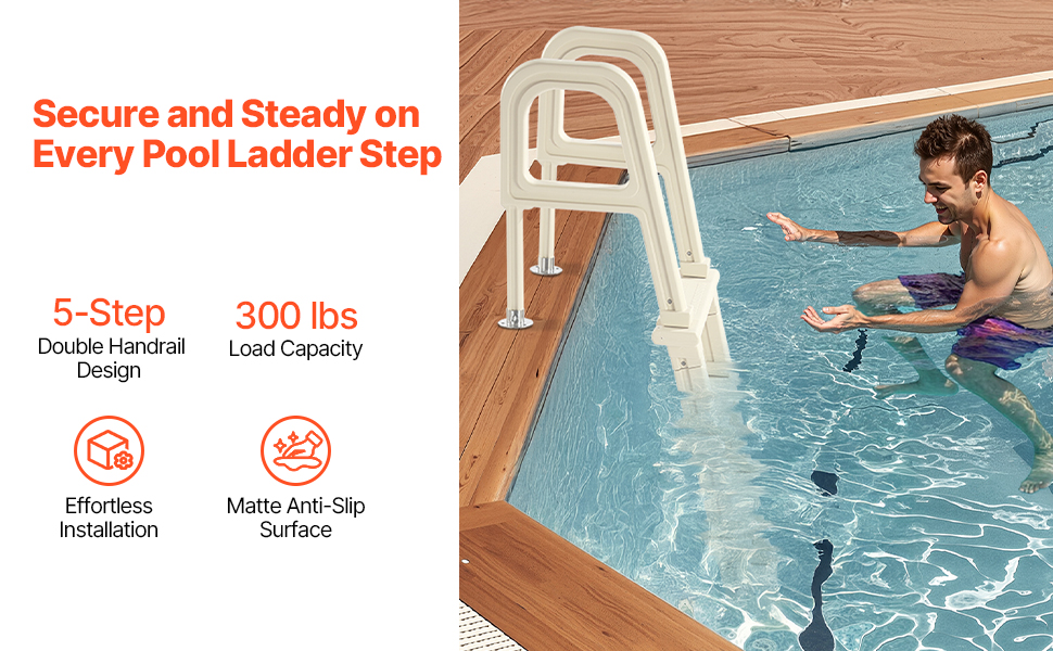 Náš 5-stupňový bazénový rebrík s dvojitým zábradlím ponúka stabilný a bezpečný vstup a výstup. Unesie až 300 lb a je vhodný pre všetkých používateľov. Inštalácia je jednoduchá a zábradlia zaisťujú pevné uchopenie. Vďaka dlhotrvajúcej stabilite je rebrík ideálny pre vnútorné aj vonkajšie bazény.