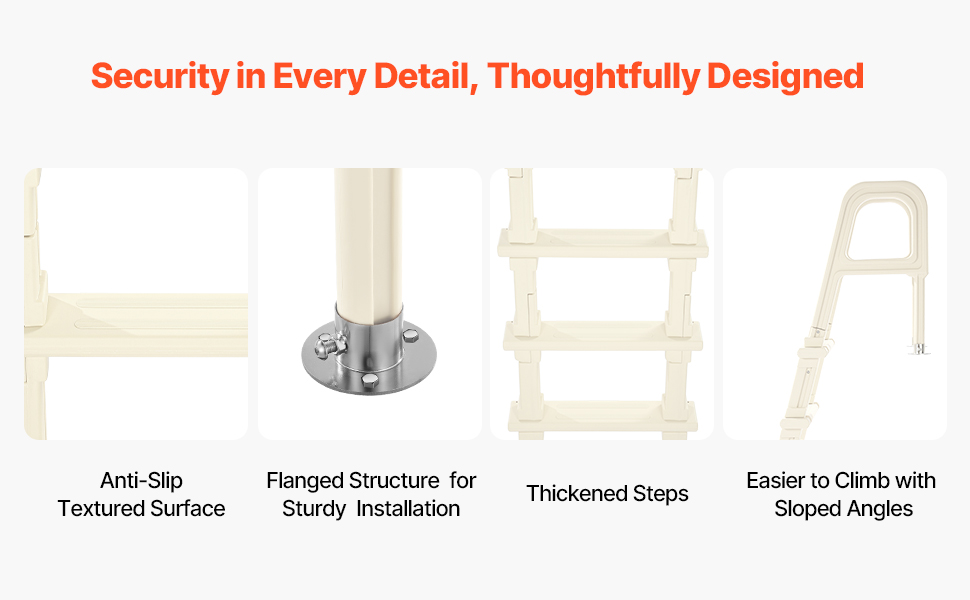 Náš bazénový rebrík sa dodáva s prírubovým montážnym príslušenstvom. Postupne zhrubnuté stupne zabezpečujú bezpečný vstup a výstup a pomáhajú predchádzať pošmyknutiam a pádom.