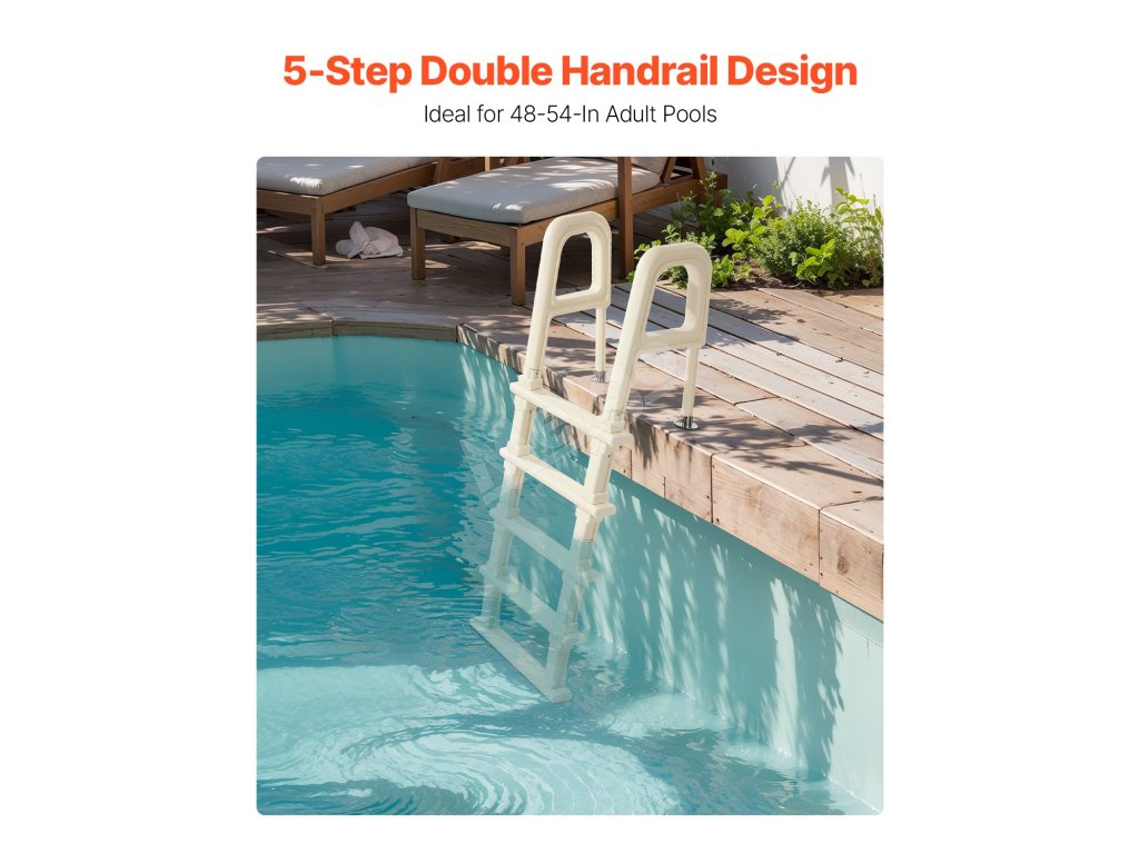 Náš 5-stupňový bazénový rebrík s dvojitým zábradlím ponúka stabilný a bezpečný vstup a výstup. Unesie až 300 lb a je vhodný pre všetkých používateľov. Inštalácia je jednoduchá a zábradlia zaisťujú pevné uchopenie. Vďaka dlhotrvajúcej stabilite je rebrík ideálny pre vnútorné aj vonkajšie bazény.