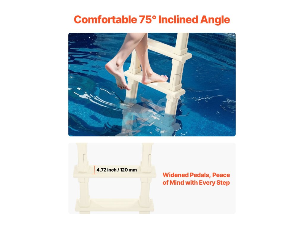 Náš bazénový rebrík sa dodáva s prírubovým montážnym príslušenstvom. Postupne zhrubnuté stupne zabezpečujú bezpečný vstup a výstup a pomáhajú predchádzať pošmyknutiam a pádom.