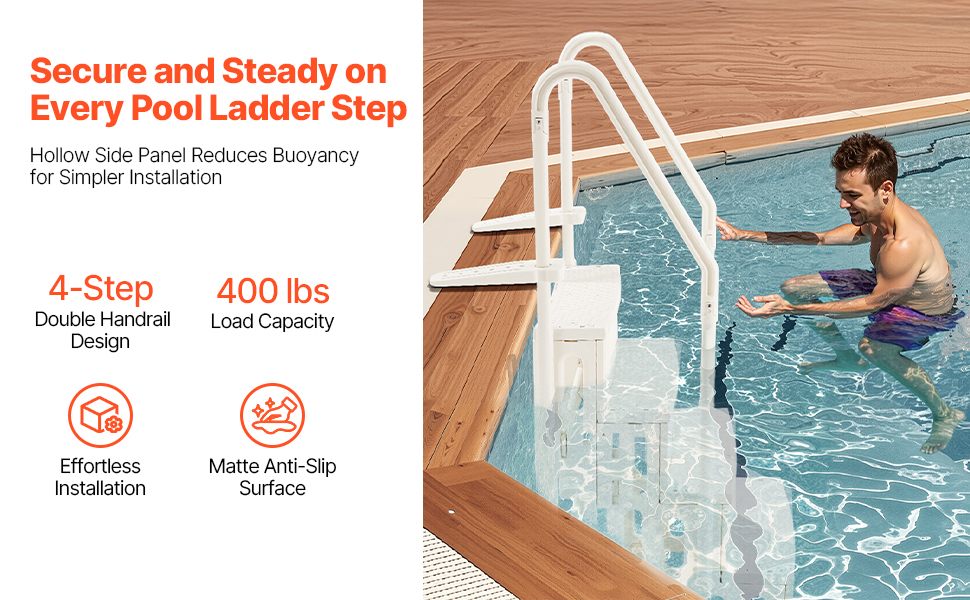 Náš 4-stupňový bazénový rebrík s dvojitým zábradlím ponúka stabilný a bezpečný vstup a výstup z bazéna. Vďaka nosnosti do 400 kg je vhodný pre používateľov všetkých veľkostí. Inštalácia je jednoduchá a hladké zábradlia zaisťujú pevné uchopenie. Vďaka dlhotrvajúcej stabilite je tento rebrík istý pre vnútorné aj vonkajšie bazény.
