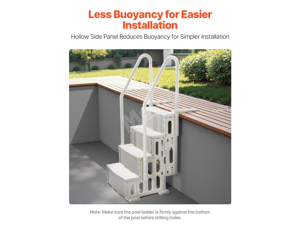 Tento rebrík, vybavený panelmi s nastaviteľnou výškou a predvŕtanými otvormi, umožňuje rýchlu a jednoduchú inštaláciu. Stačí postupovať podľa pokynov, môžete ho nainštalovať do svojho bazéna rovnako ako profesionál a začať ho ihneď používať!