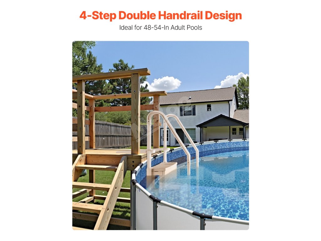 Náš 4-stupňový bazénový rebrík s dvojitým zábradlím ponúka stabilný a bezpečný vstup a výstup z bazéna. Vďaka nosnosti do 400 kg je vhodný pre používateľov všetkých veľkostí. Inštalácia je jednoduchá a hladké zábradlia zaisťujú pevné uchopenie. Vďaka dlhotrvajúcej stabilite je tento rebrík istý pre vnútorné aj vonkajšie bazény.