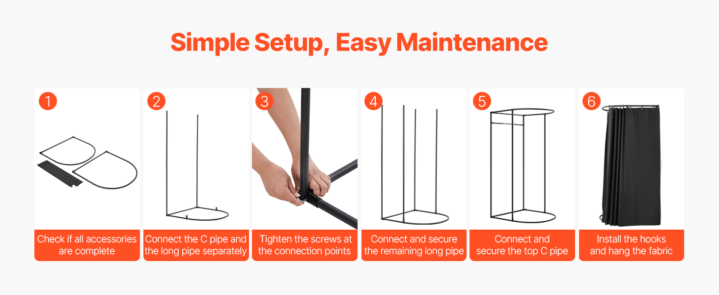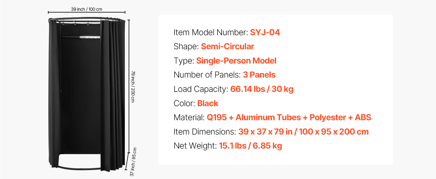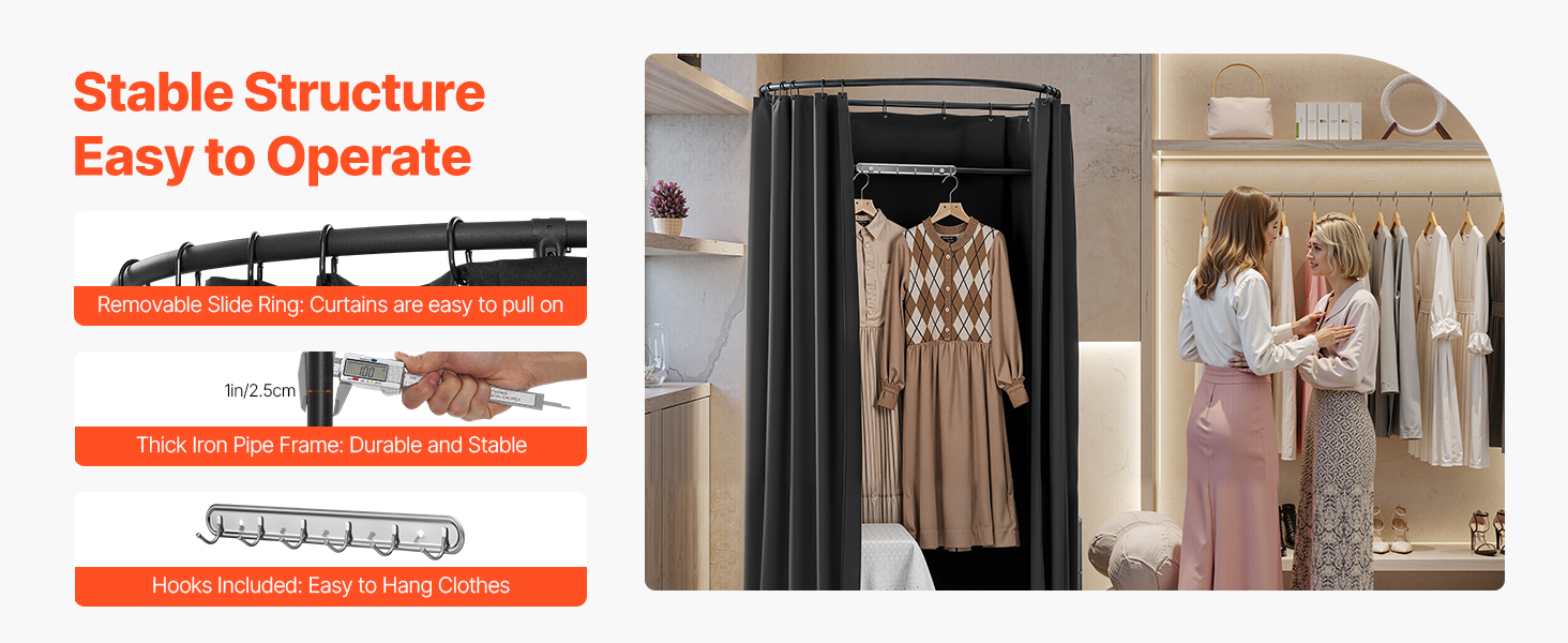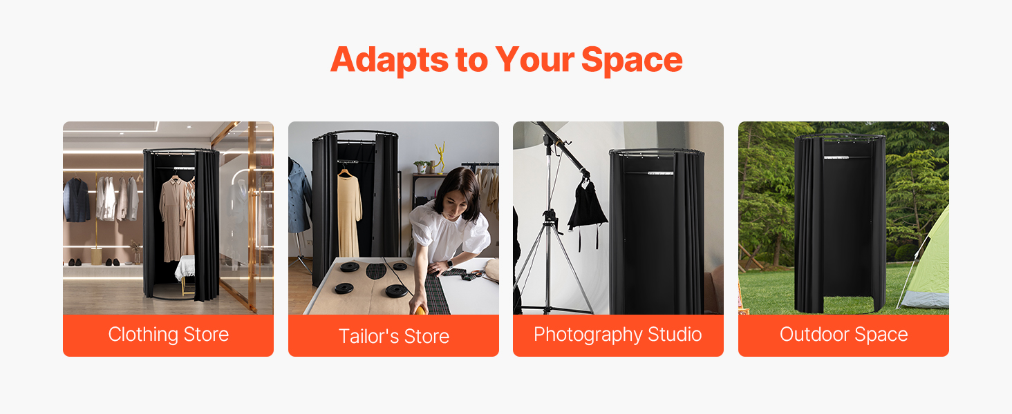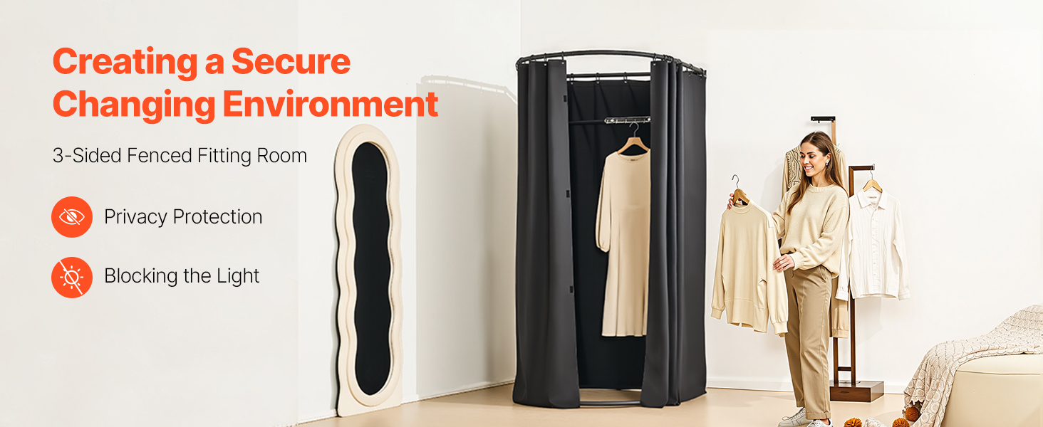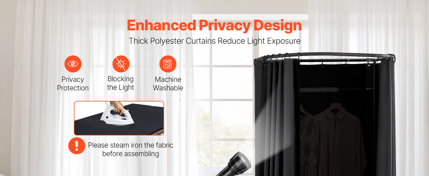 Vyrobená z polyesterovej tkaniny blokujúcej svetlo, ktorá zabezpečuje súkromie a je odolná proti pokrčeniu. Robustný železný rám zaisťuje stabilitu a poskytuje bezpečný priestor na prezliekanie, ideálny pre obchodné centrá, butiky, ateliéry, obchody so svadobnými šatami a ďalšie.