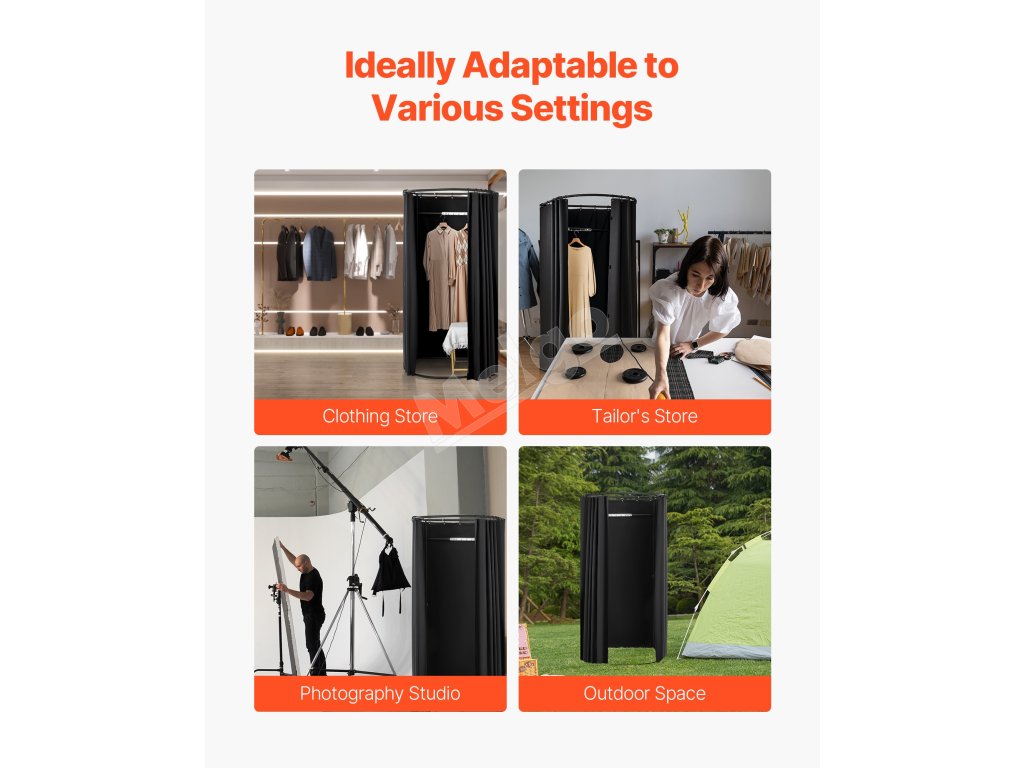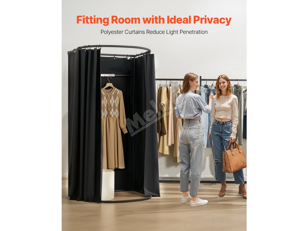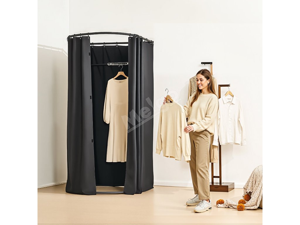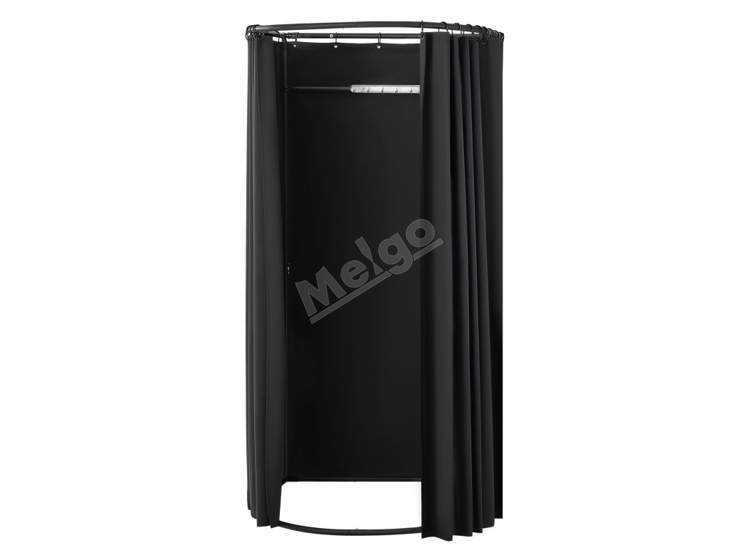 Vyrobená z polyesterovej tkaniny blokujúcej svetlo, ktorá zabezpečuje súkromie a je odolná proti pokrčeniu. Robustný železný rám zaisťuje stabilitu a poskytuje bezpečný priestor na prezliekanie, ideálny pre obchodné centrá, butiky, ateliéry, obchody so svadobnými šatami a ďalšie.