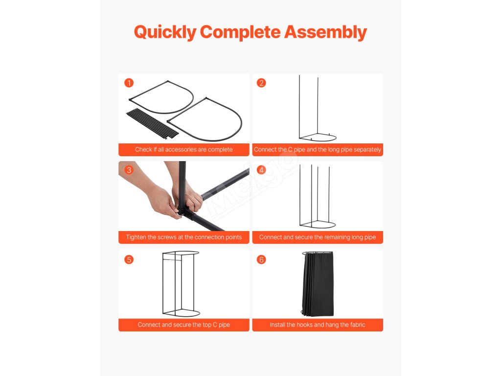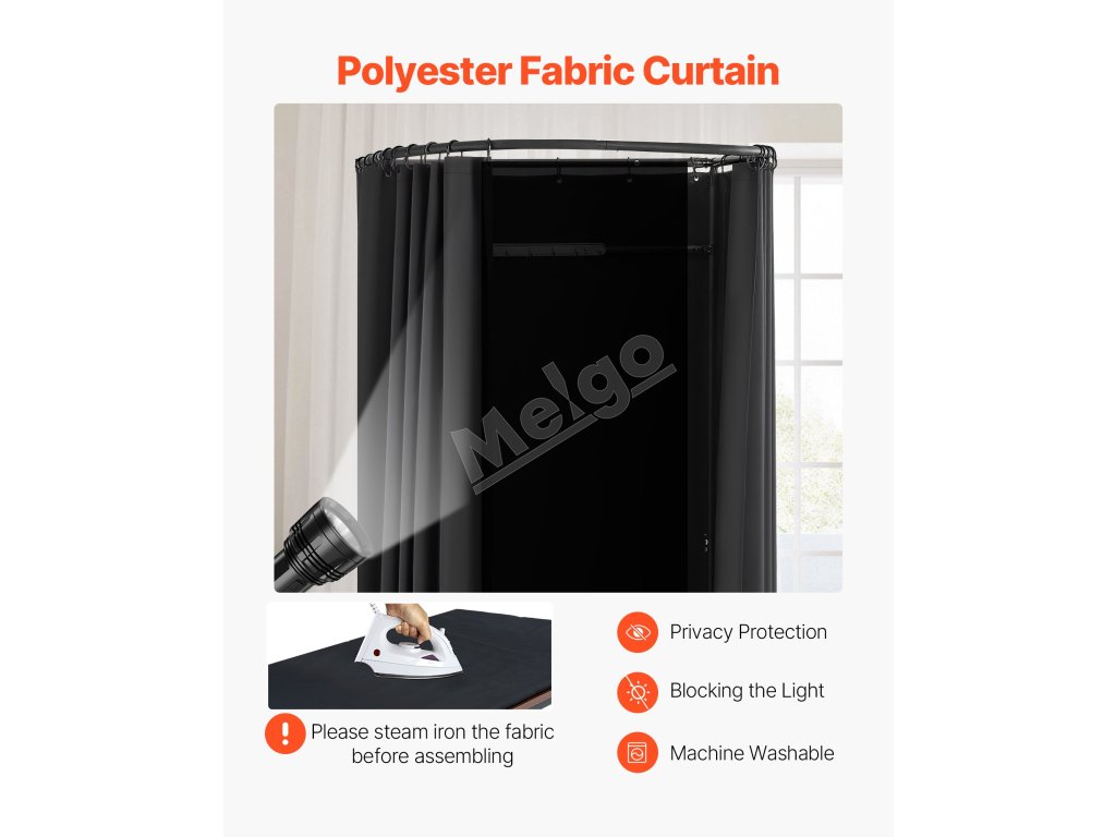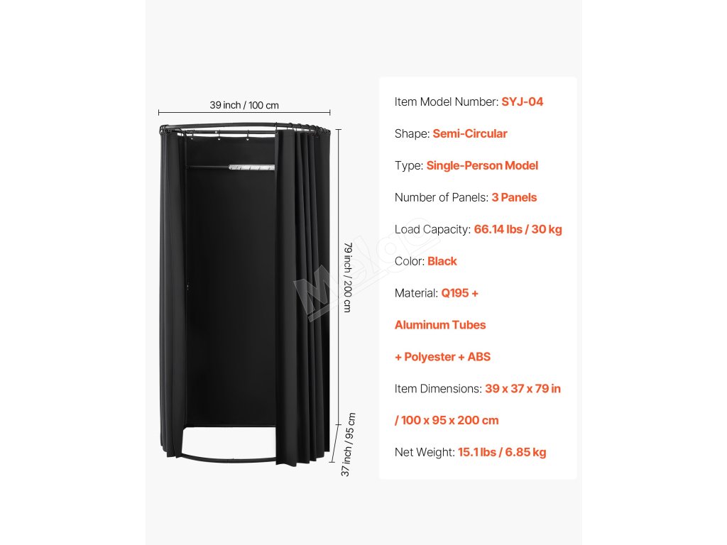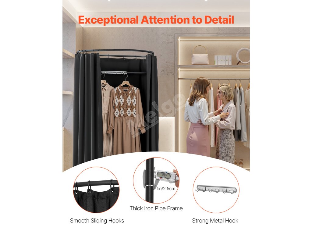 Vyrobená z polyesterovej tkaniny blokujúcej svetlo, ktorá zabezpečuje súkromie a je odolná proti pokrčeniu. Robustný železný rám zaisťuje stabilitu a poskytuje bezpečný priestor na prezliekanie, ideálny pre obchodné centrá, butiky, ateliéry, obchody so svadobnými šatami a ďalšie.