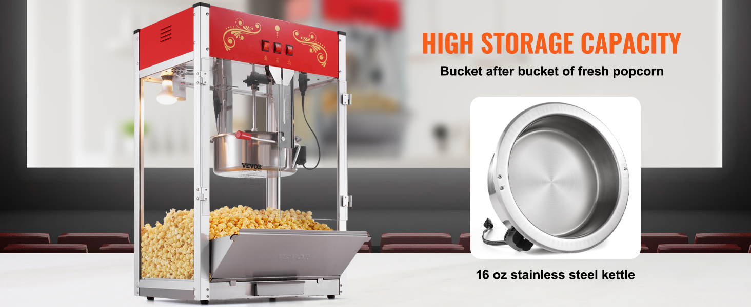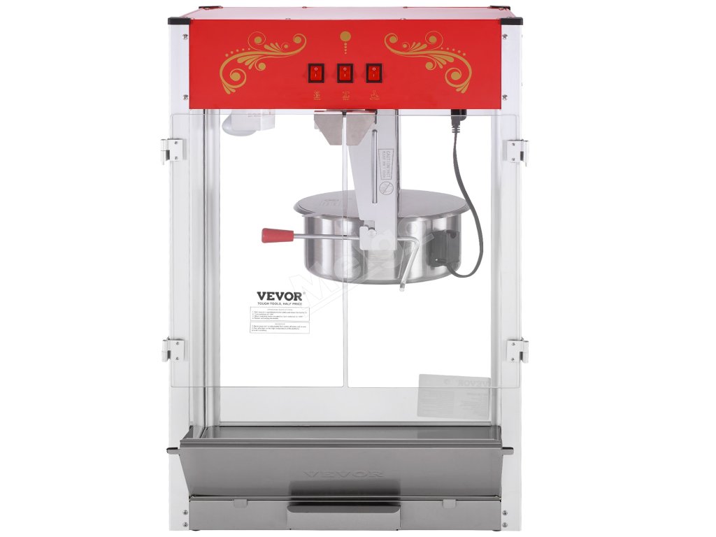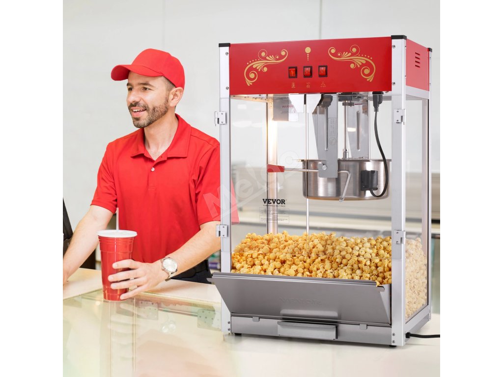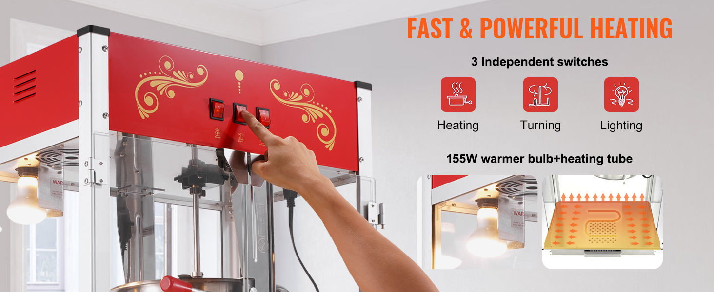 Zariadenie na výrobu popcornu je vybavené 155W vykurovacím telesom a svetelnou kontrolkou ohrevu, zariadenie začne variť a hotový popcorn padá na ohrievací podnos, aby zostal čerstvý, kým nebudete pripravení ho podávať.