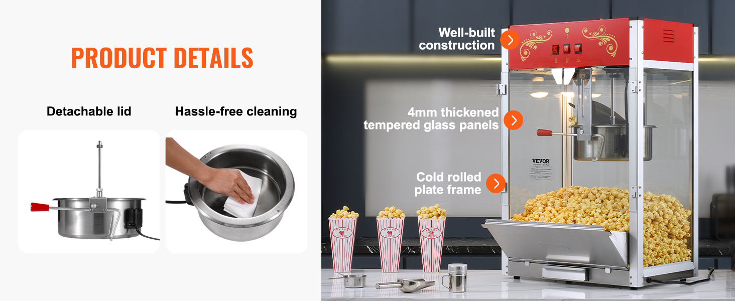 Tento stolový popkornovač je skonštruovaný z rámu zo za studena valcovaného plechu a panelov z tvrdeného skla, pričom všetky časti sú vyrobené z potravinárskej nehrdzavejúcej ocele. Krídlová matica umožňuje jednoduché odstránenie veka na dôkladné čistenie, čím sa zabezpečí jednoduchá údržba, ktorá predĺži životnosť zariadenia.