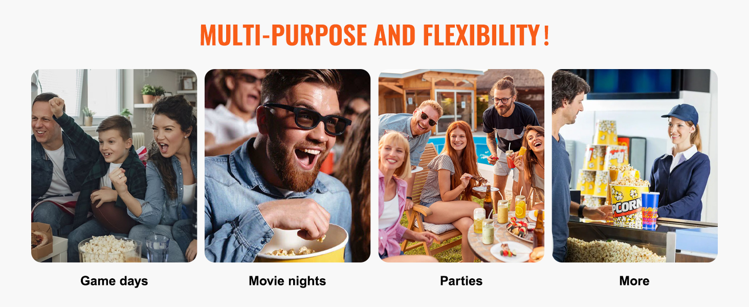 Tento stroj na výrobu popcornu je vhodný na rôzne podujatia vrátane narodeninových osláv, stretnutí, finančných zbierok a športových podujatí.