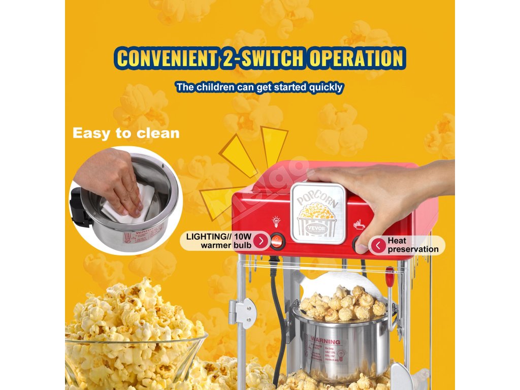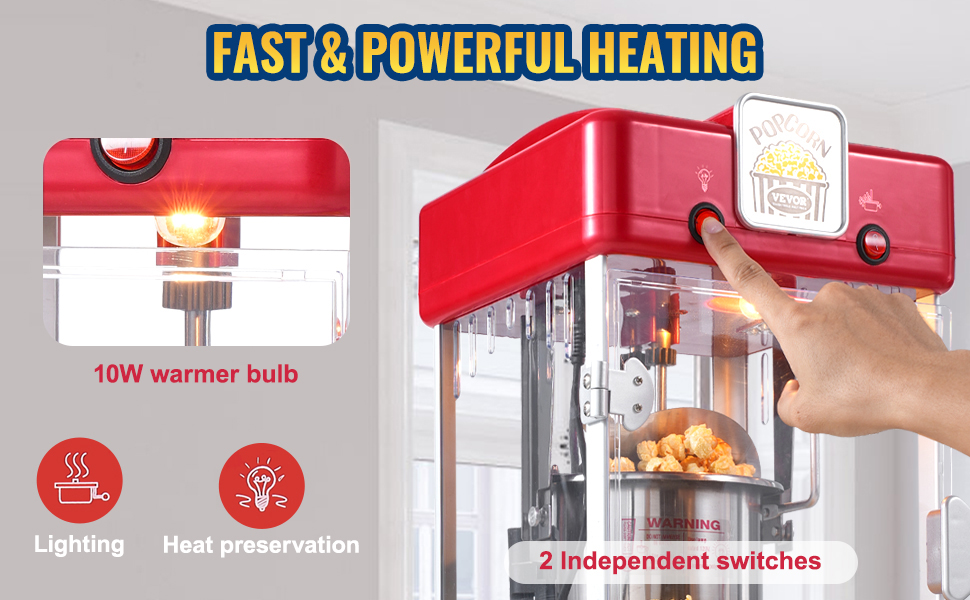 Nezávislá konštrukcia s dvojitým spínačom umožňuje, aby zariadenie na výrobu popcornu začalo variť; hotový popcorn spadne na ohrievací podnos, aby zostal čerstvý, kým nebudete pripravení ho podávať. Teplé 10W svetlo jasne osvetlí váš popcorn.