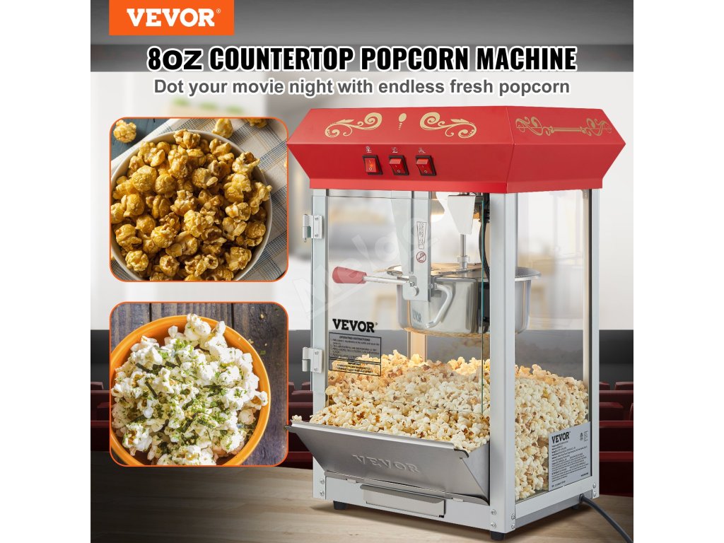 Stroj na popcorn 850 W, kotlík 8 oz, 48 šálok, tvrdené sklo, 4 lyžice