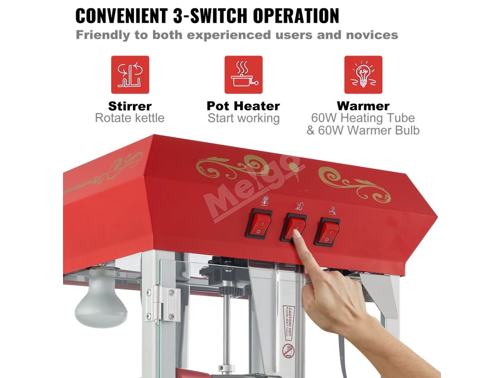 Pod ohrievacím podnosom sa nachádza 50W ohrievacie teleso a po začatí varenia zostane hotový popcorn čerstvý, kým ho nebudete pripravení podávať. Ohrievacie svetlo s výkonom 60 W jasne osvetlí váš popcorn.