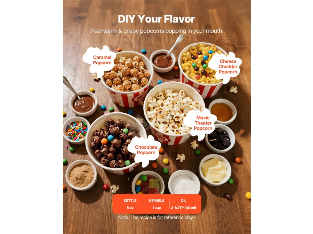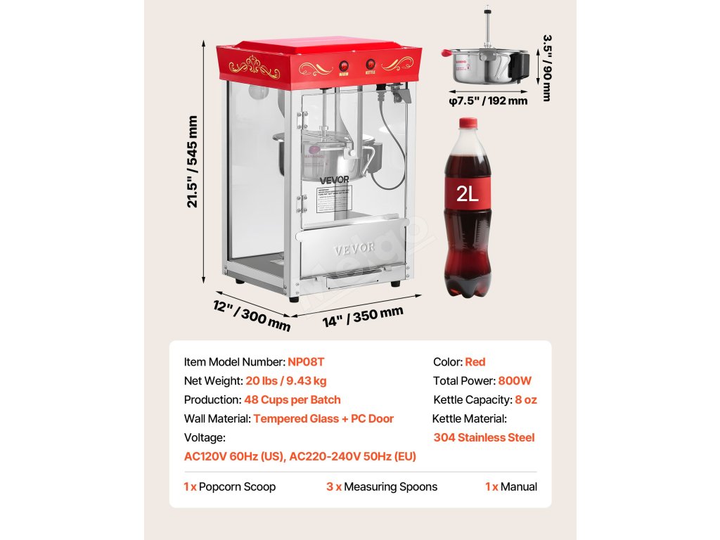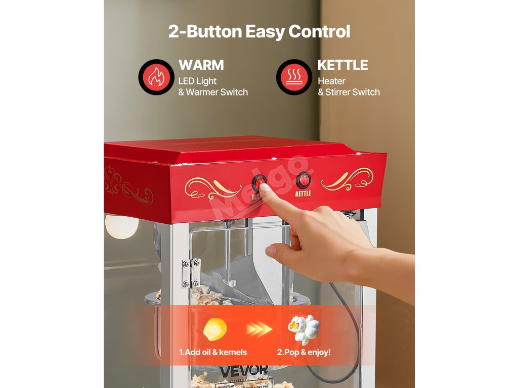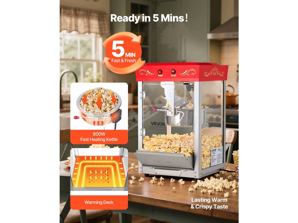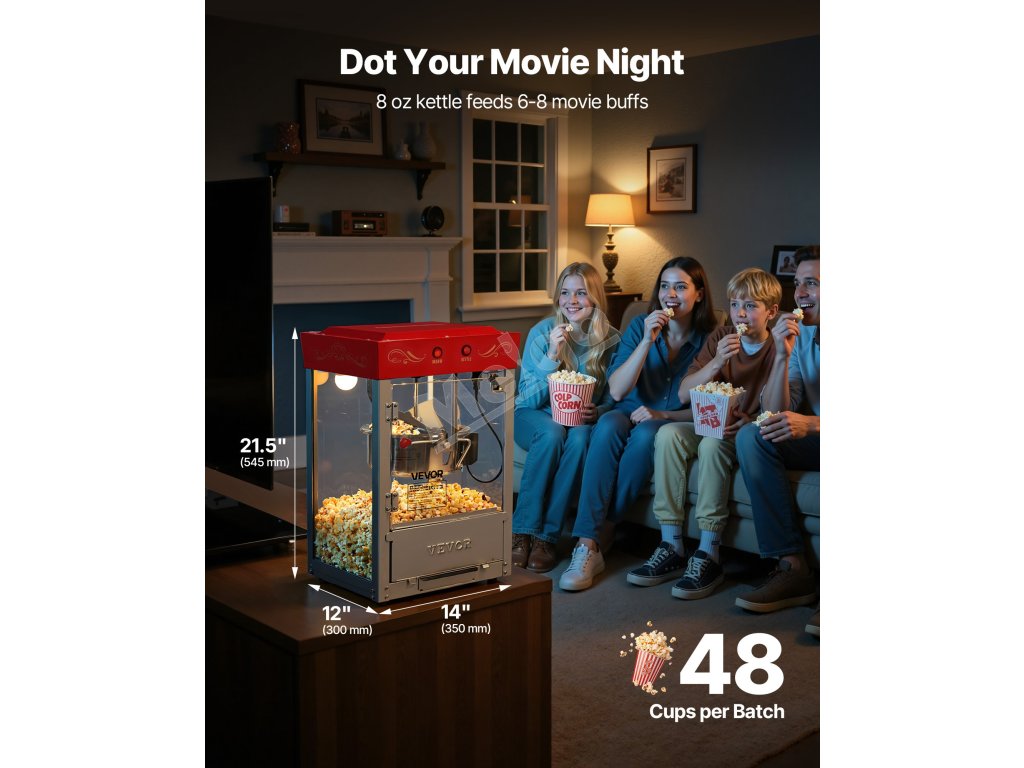 S týmto popkornovačom s kapacitou 8 oz vytvoríte vedro čerstvého popcornu za vedrom a na jednu dávku pripravíte až 48 šálok, ktoré nasýtia 6-8 ľudí. Nenechajte si ujsť tento vynikajúci doplnok do domácich kín, na párty na dvore, karnevaly, športové podujatia a iné využitie!