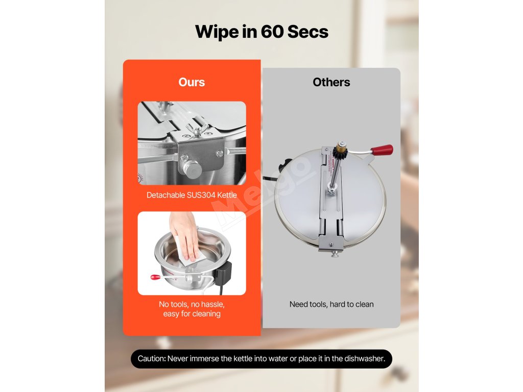 Otázka č. 1: Ako zabránim tomu, aby sa mi popcorn nerozpukol a nemal mäkkú, spálenú štruktúru?A1: Rozpuknuté zrná, mäkká alebo spálená kukurica sú spôsobené nedostatočným množstvom oleja. Pre referenciu poskytujeme návod na recept. Ďalším dôvodom je používanie kukurice s vysokou vlhkosťou, prechod na kukuricu s nízkou vlhkosťou to môže vyriešiť. Kondenzácia na stenách počas používania je normálna. otázka č. 2: Dá sa popkornovač ľahko rozobrať a vyčistiť? A2: Náš popkornovač je vybavený odnímateľnými časťami bez použitia náradia (kanvica, zachytávač jadier), ktoré sa dajú vyčistiť za niekoľko sekúnd. 3. otázka: Môžem ho používať vonku na podujatiach? Stroj je skonštruovaný na vnútorné aj vonkajšie použitie. Na vonkajšie podujatia, ako sú karnevaly alebo párty na dvore, ho môžete spárovať s naším prachotesným vekom.