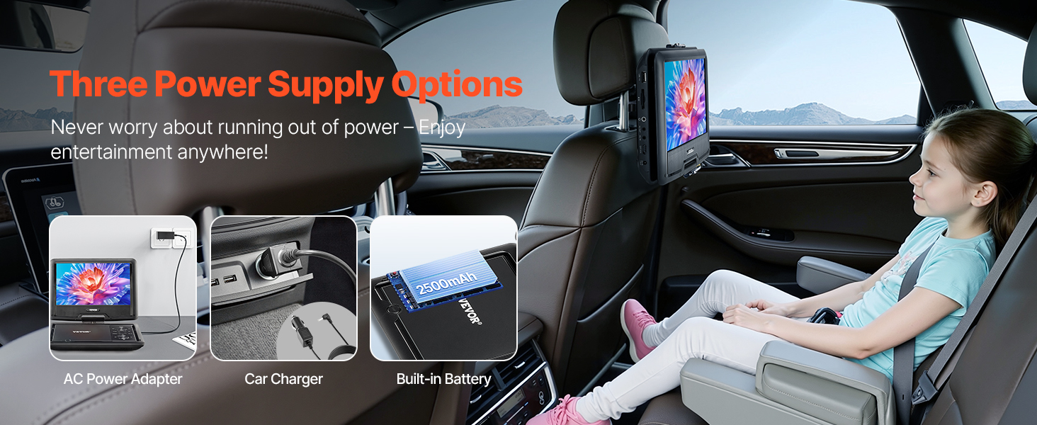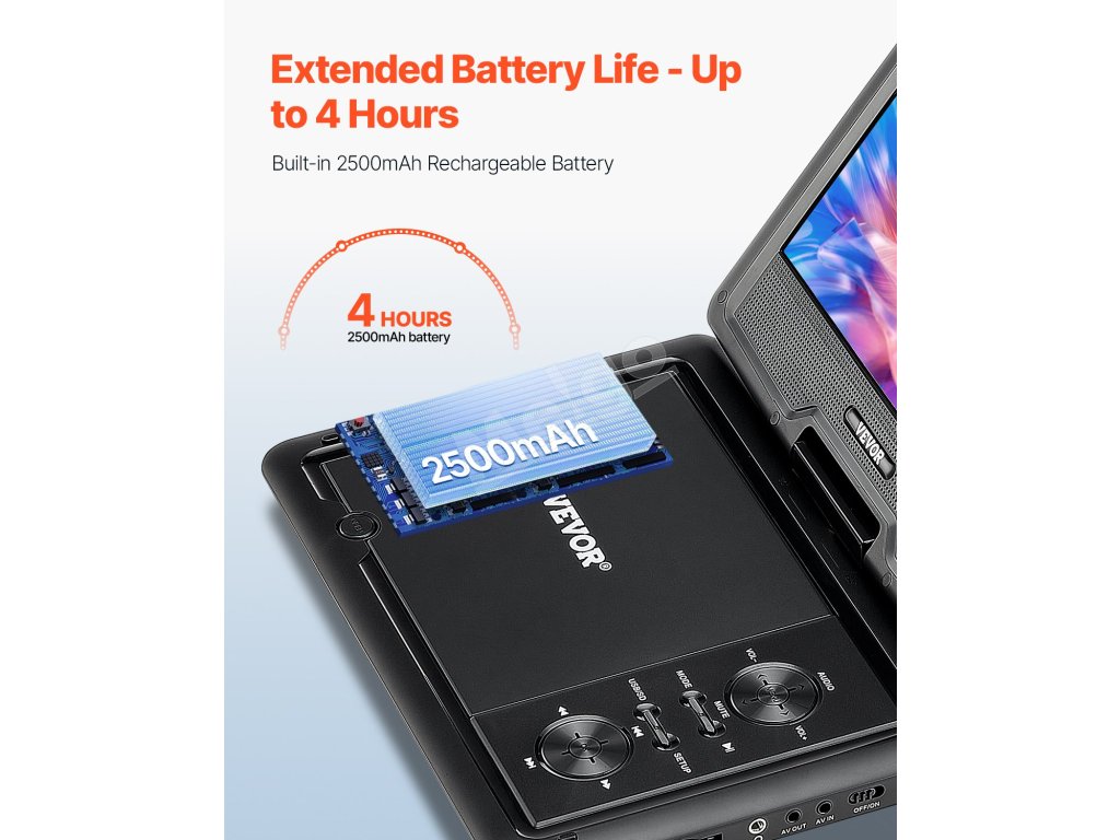 Prenosný DVD prehrávač s obrazovkou má zabudovanú batériu. Užívajte si dlhšie používanie bez obáv z vybitia energie. Sieťový adaptér je ideálny na domáce použitie a nabíjačka do auta umožňuje pohodlné cestovanie. Či už na cesty, alebo na každodenné používanie, je pripravený zabaviť sa v akomkoľvek prostredí.