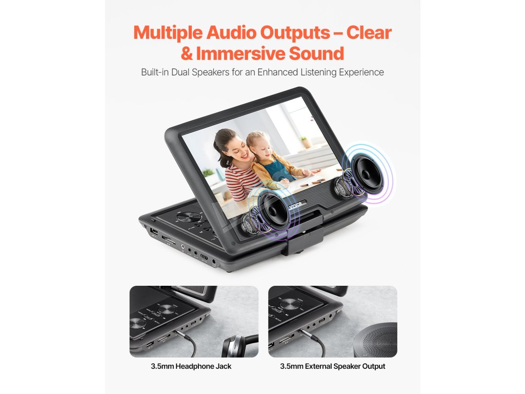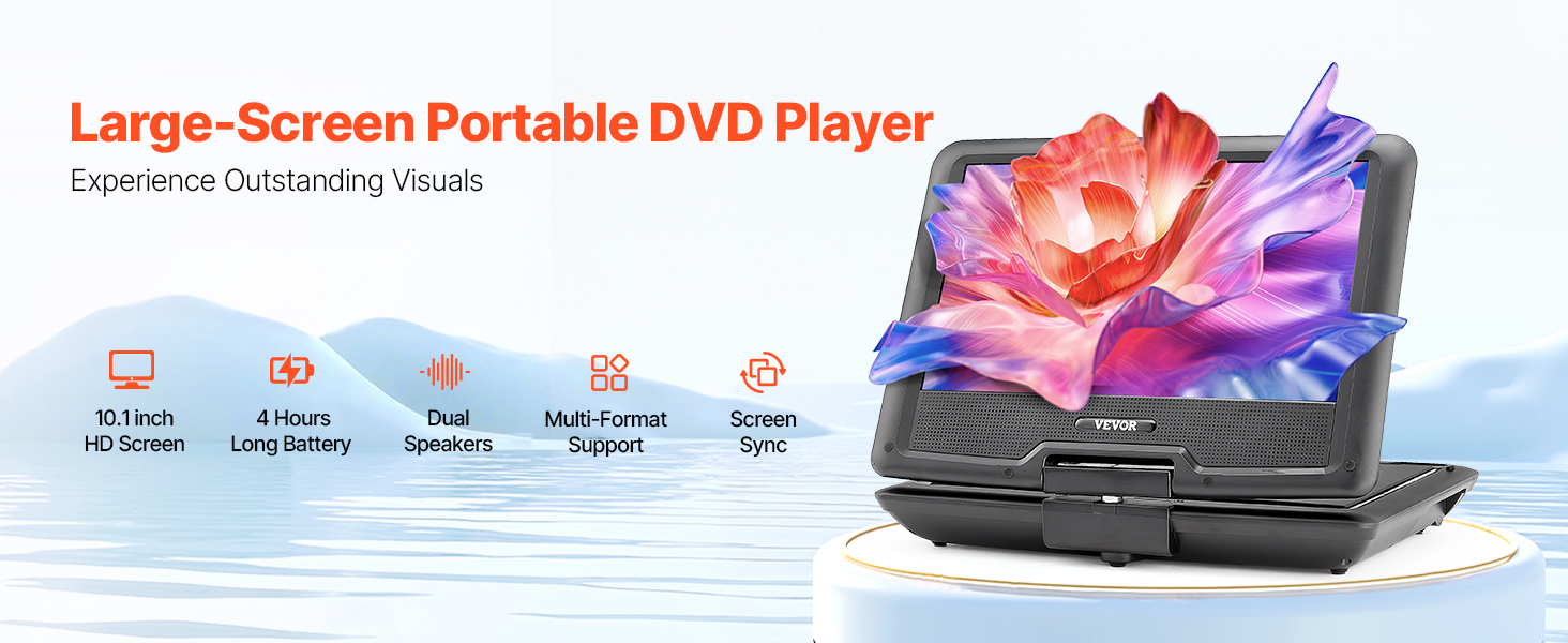 Tento prenosný DVD prehrávač s 10,1-palcovou HD obrazovkou (rozlíšenie 1024 x 600) a výdržou batérie 4 hodiny vám umožní vychutnať si ostrý obraz a dlhé sledovanie. Duálne reproduktory sa postarajú o pohlcujúci zvuk a podpora viacerých formátov splní vaše multimediálne potreby. Funkcia synchronizácie obrazovky uľahčuje zdieľanie obsahu.