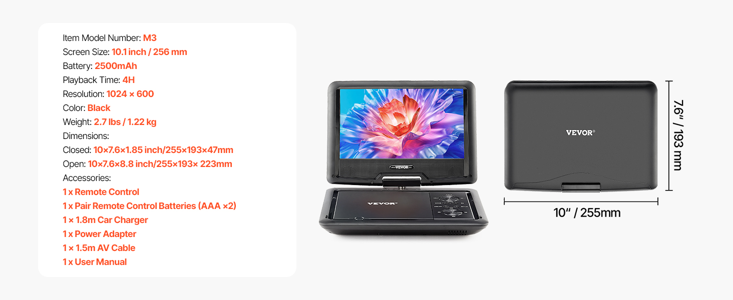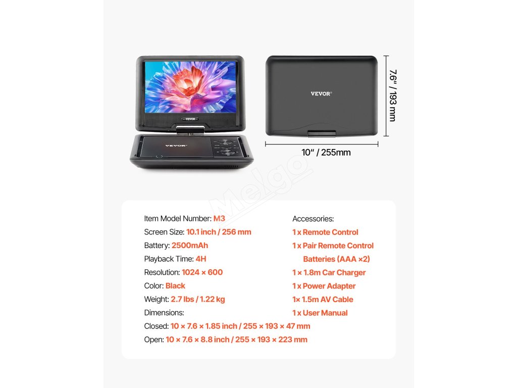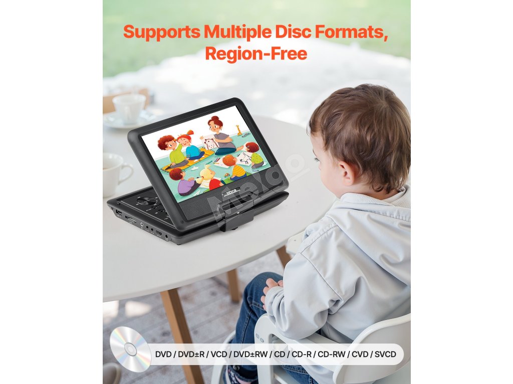 Tento cestovný DVD prehrávač je kompatibilný s diskami všetkých regiónov vrátane DVD, DVD±R, DVD±RW, VCD, CD, CD-R, CD-RW, CVD a SVCD. Podporuje tiež karty USB a SD (až do 32 GB, video v rozlíšení 1024 x 600 HD) a formáty, ako sú MPEG1, MPEG2, MPEG4 pre video, MP3, WMA pre zvuk a JPEG, JPG pre fotografie.