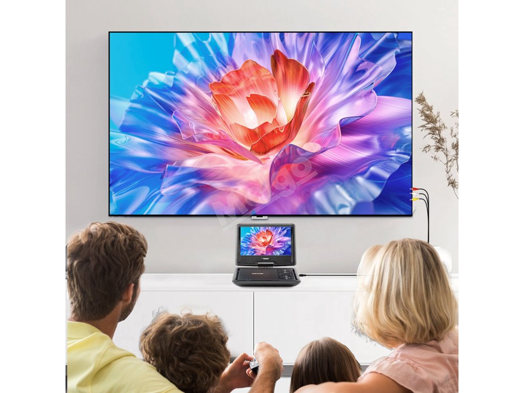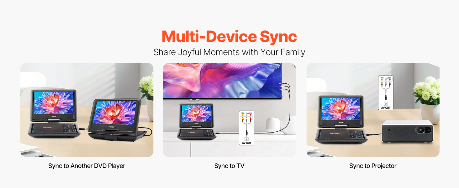 Vďaka AV výstupu môžete obrazovku zariadenia jednoducho synchronizovať s iným DVD prehrávačom rovnakého modelu, televízorom alebo projektorom na spoločné sledovanie. Užite si viac zábavy s rodinou a priateľmi prostredníctvom zábavy na viacerých obrazovkách.