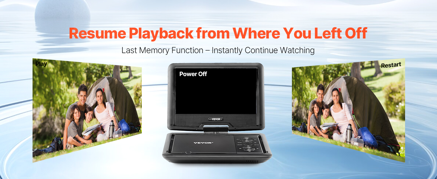 Tento DVD prehrávač s obrazovkou je vybavený funkciou poslednej pamäte, ktorá si automaticky zapamätá poslednú pozíciu prezerania, či už je pozastavená, vypnutá alebo znovu spustená. Nemusíte znovu hľadať svoje miesto - jednoducho pokračujte v sledovaní a vychutnajte si bezproblémový zážitok zo sledovania.