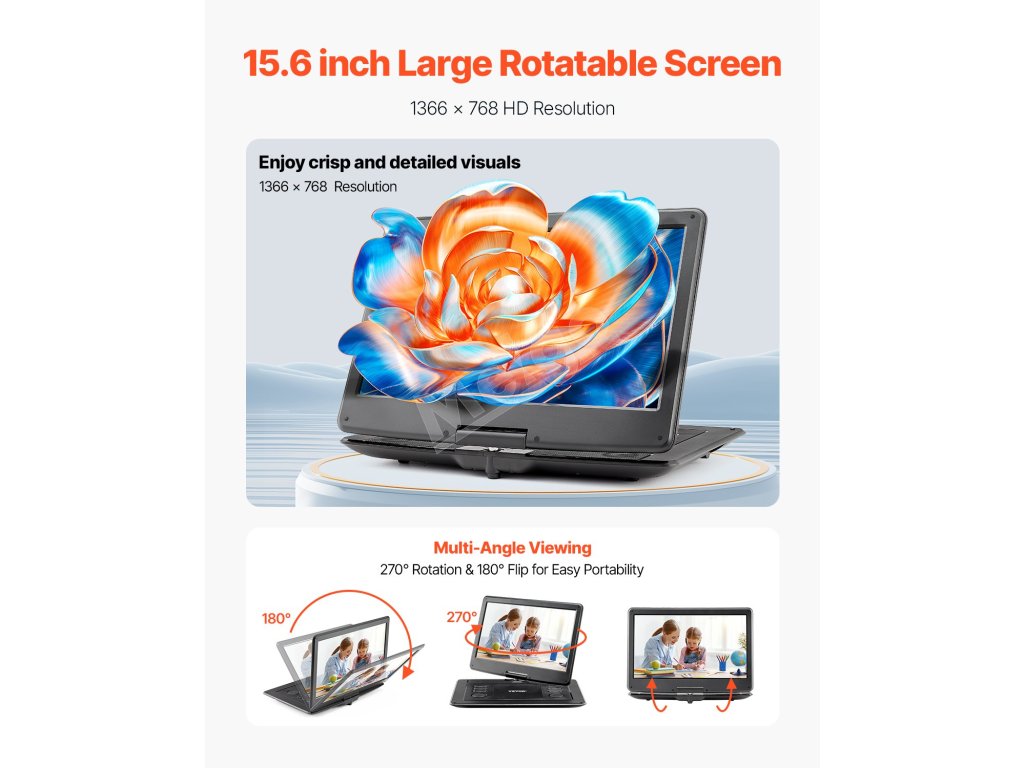 Prenosný dvd prehrávač 15.6 inch hd otočný displej, 5h batéria