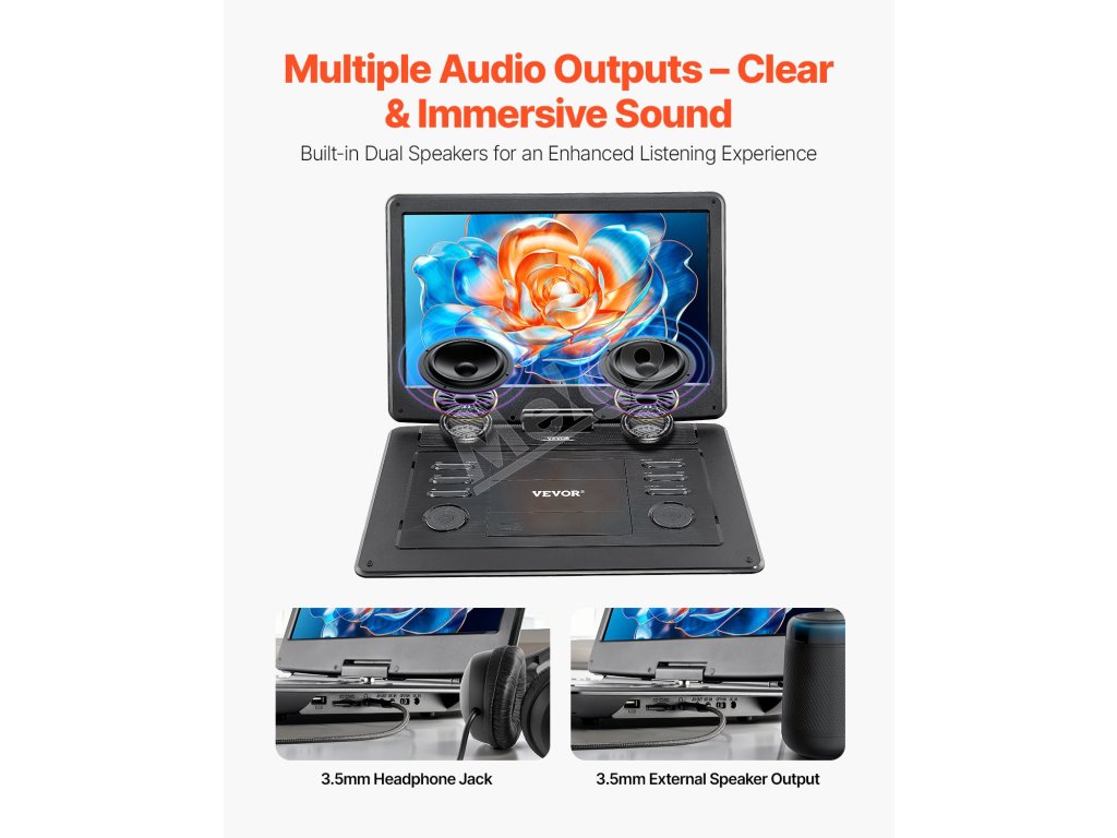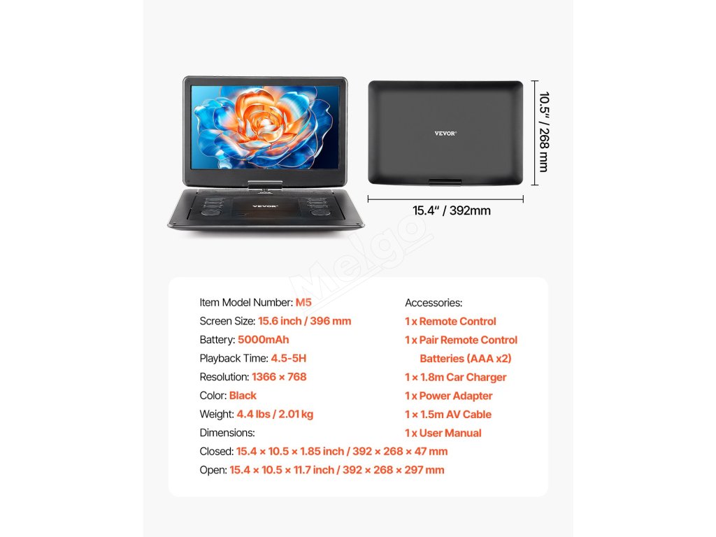 Tento prenosný DVD prehrávač s 15,6-palcovou HD obrazovkou (rozlíšenie 1366 x 768) a výdržou batérie 4,5-5 hodín vám umožní vychutnať si ostrý obraz a dlhé sledovanie. Duálne reproduktory sa postarajú o pohlcujúci zvuk a podpora viacerých formátov splní vaše multimediálne potreby. Funkcia synchronizácie obrazovky uľahčuje zdieľanie obsahu.