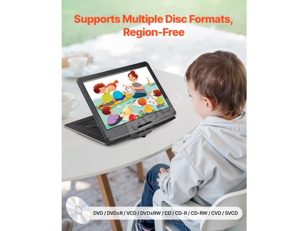 Tento cestovný DVD prehrávač je kompatibilný s diskami všetkých regiónov vrátane DVD, DVD±R, DVD±RW, VCD, CD, CD-R, CD-RW, CVD a SVCD. Podporuje tiež karty USB a SD (až do 32 GB, video v rozlíšení 1024 x 600 HD) a formáty, ako sú MPEG1, MPEG2, MPEG4 pre video, MP3, WMA pre zvuk a JPEG, JPG pre fotografie.