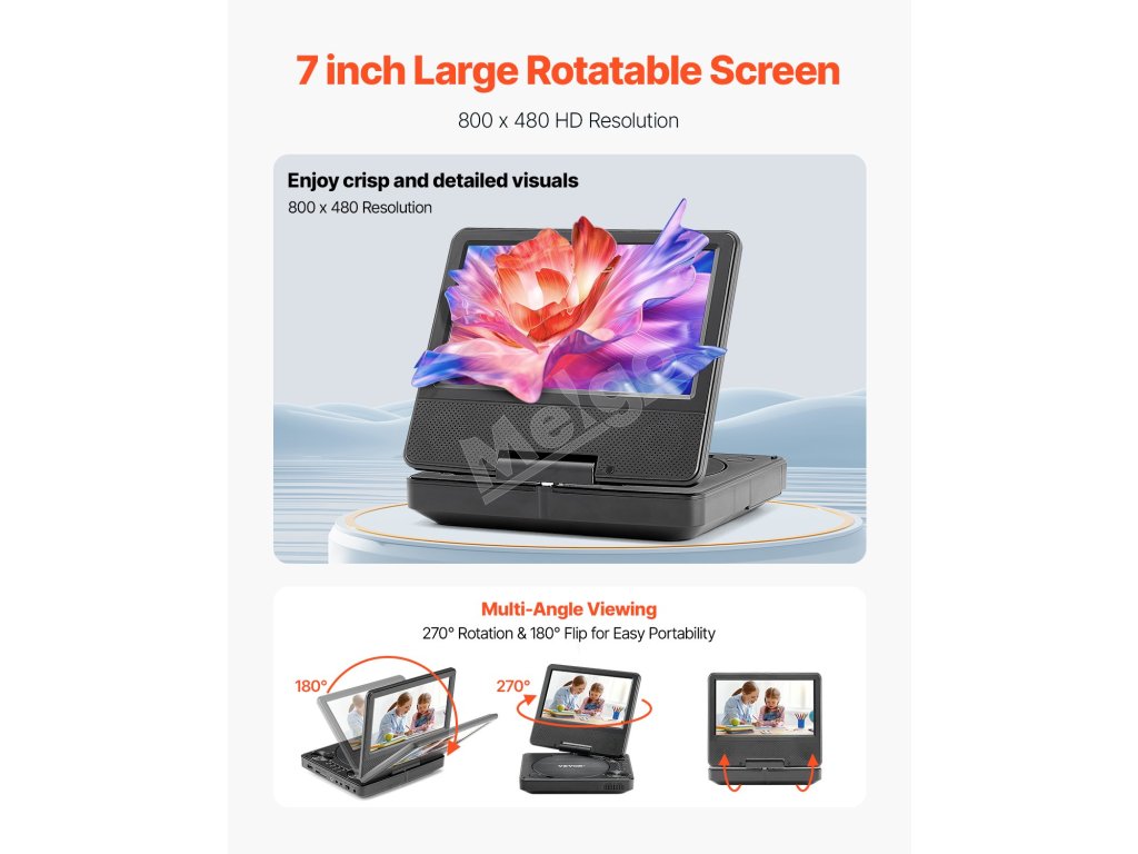 Tento prenosný DVD prehrávač so 7-palcovou HD obrazovkou (rozlíšenie 800 x 480) a 4 hodinami výdrže batérie vám umožní vychutnať si ostrý obraz a dlhé sledovanie. Duálne reproduktory sa postarajú o pohlcujúci zvuk a podpora viacerých formátov splní vaše multimediálne potreby. Funkcia synchronizácie obrazovky uľahčuje zdieľanie obsahu.