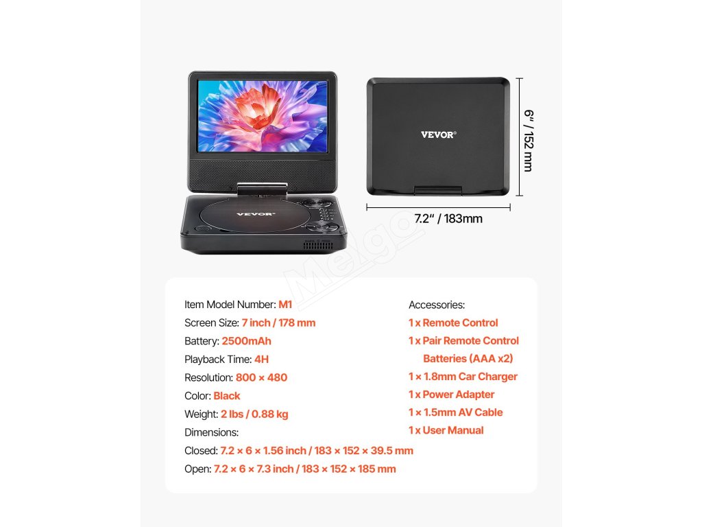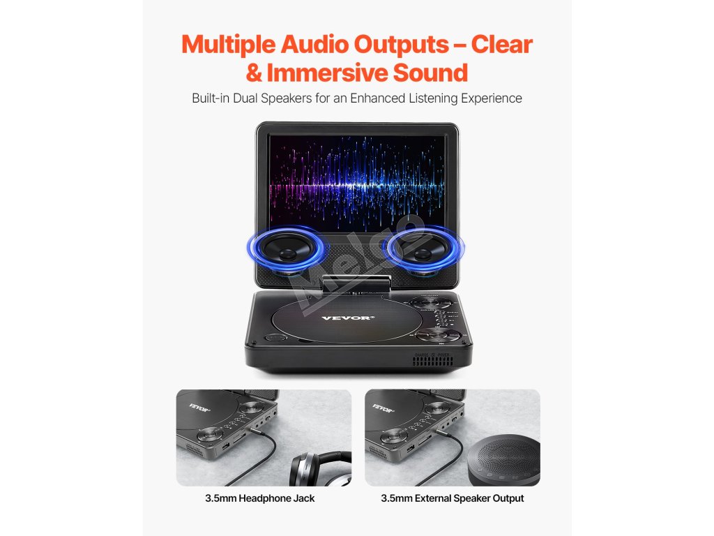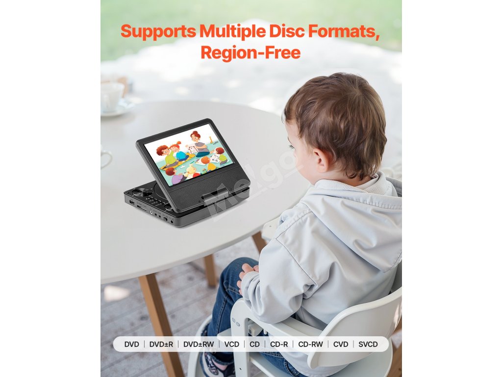 Tento cestovný DVD prehrávač je kompatibilný s diskami všetkých regiónov vrátane DVD, DVD±R, DVD±RW, VCD, CD, CD-R, CD-RW, CVD a SVCD. Podporuje tiež karty USB a SD (až do 32 GB, video v rozlíšení 1024 x 600 HD) a formáty, ako sú MPEG1, MPEG2, MPEG4 pre video, MP3, WMA pre zvuk a JPEG, JPG pre fotografie.