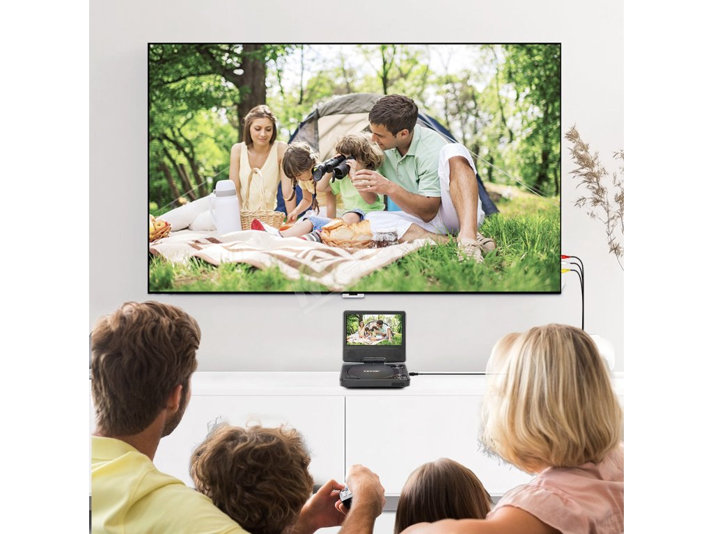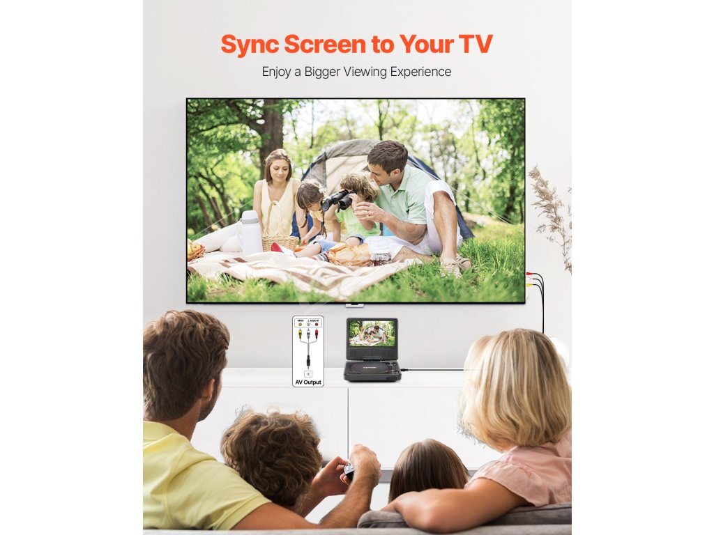Vďaka AV výstupu môžete obrazovku zariadenia jednoducho synchronizovať s iným DVD prehrávačom rovnakého modelu, televízorom alebo projektorom na spoločné sledovanie. Užite si viac zábavy s rodinou a priateľmi prostredníctvom zábavy na viacerých obrazovkách.