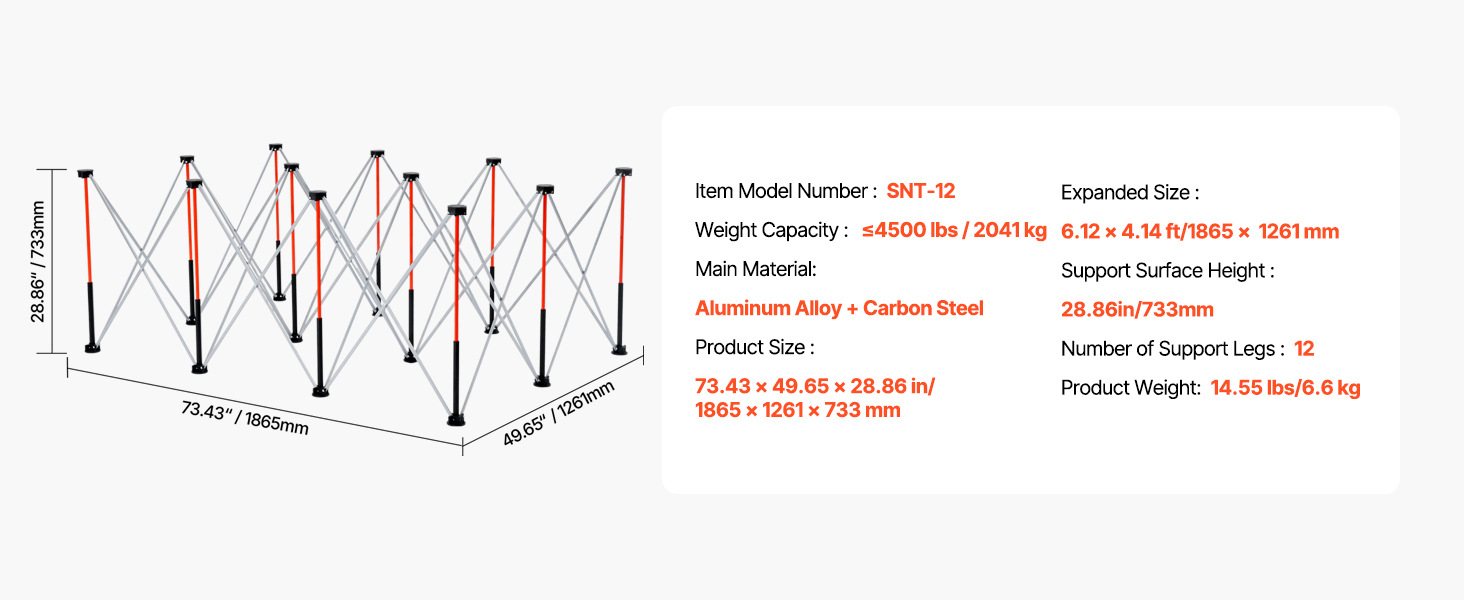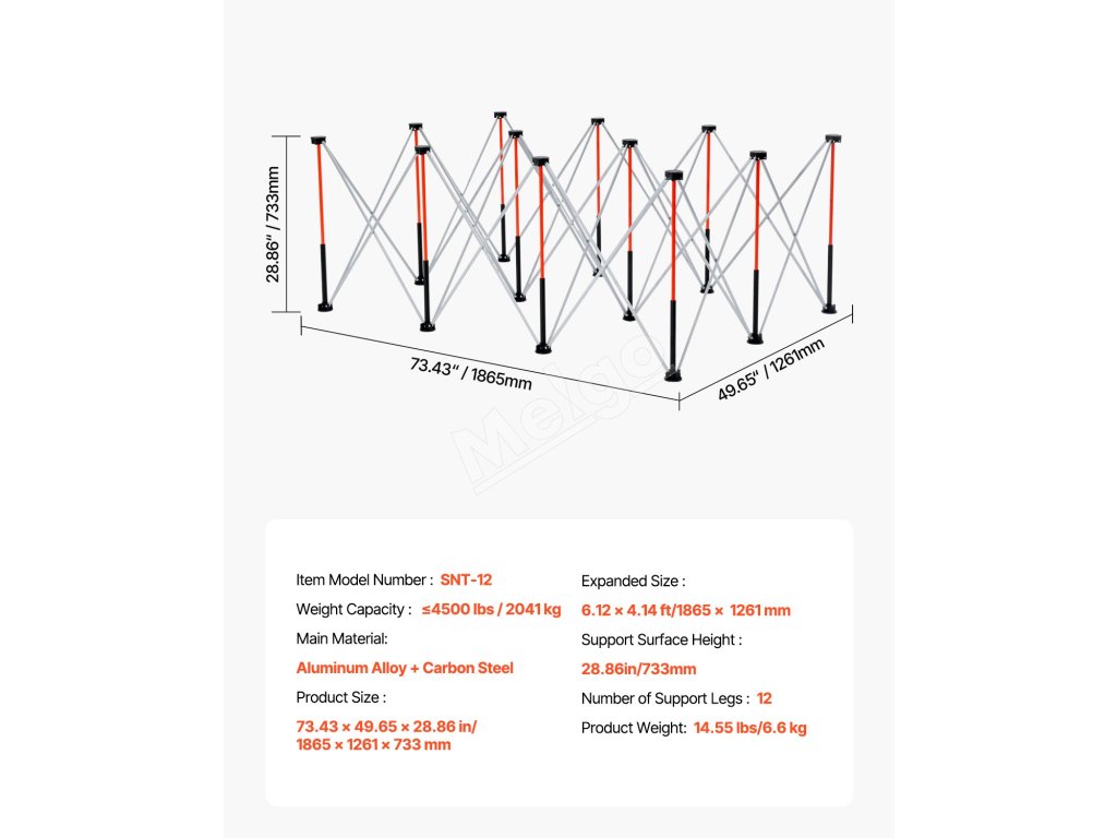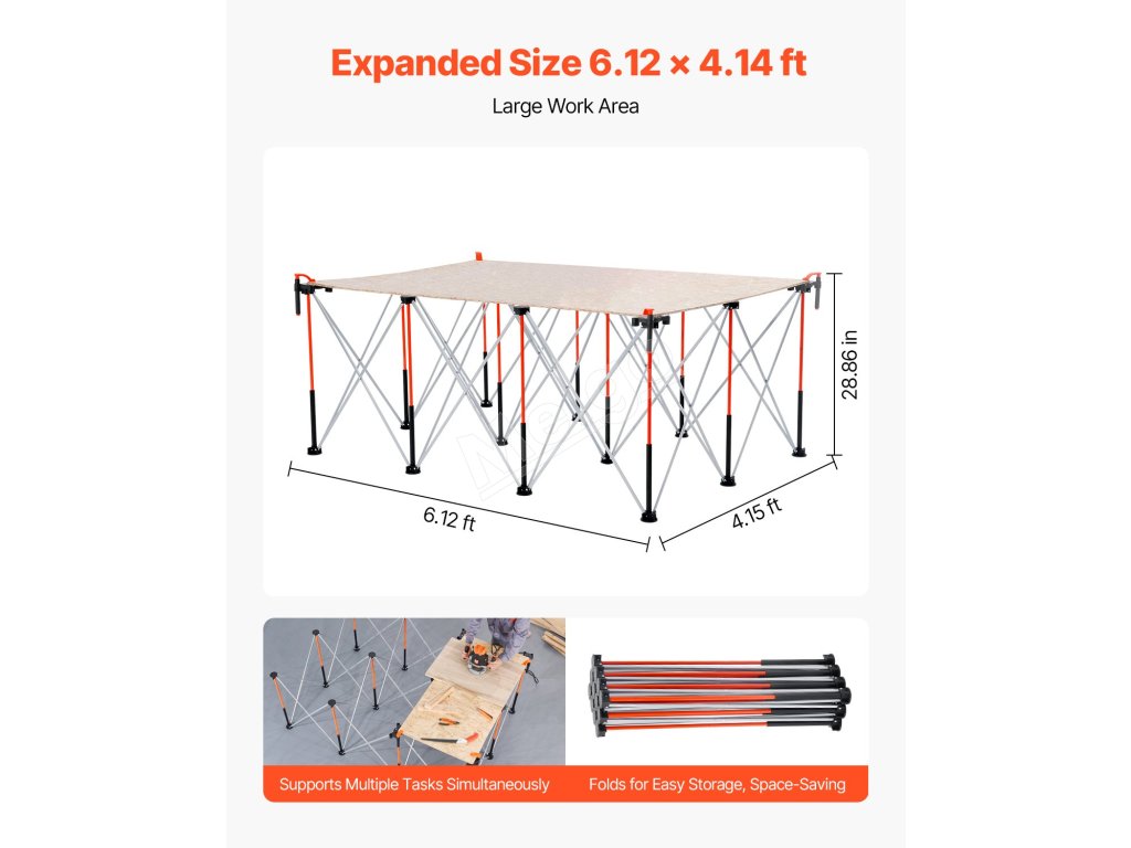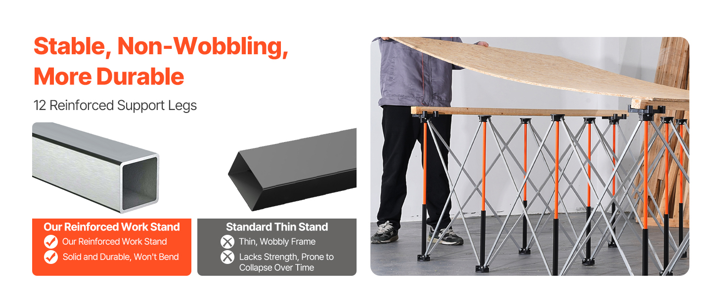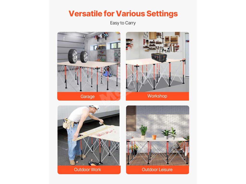 Tento skladací pracovný stojan, vybavený 12 nohami z hliníkovej zliatiny a zosilnenými rúrkami, poskytuje vynikajúcu stabilitu, vďaka čomu sa neohne ani nespadne. Zostáva pevný a stabilný aj pri veľkom zaťažení.