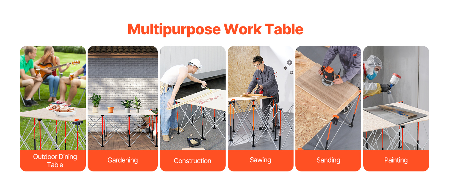 Tento prenosný skladací pracovný stolík je ideálny na rôzne úlohy, možno ho použiť ako vonkajší jedálenský stôl, na záhradkárčenie, stavbu, pílenie, brúsenie, maľovanie a iné. Je navrhnutý tak, aby spĺňal všetky vaše projektové potreby.
