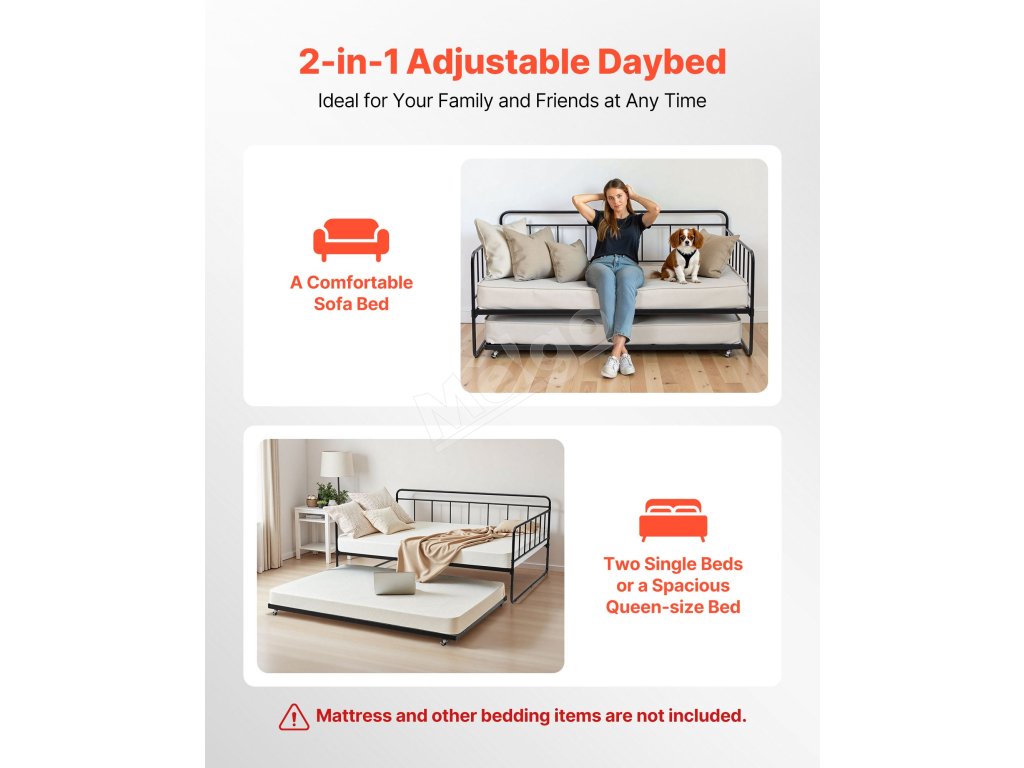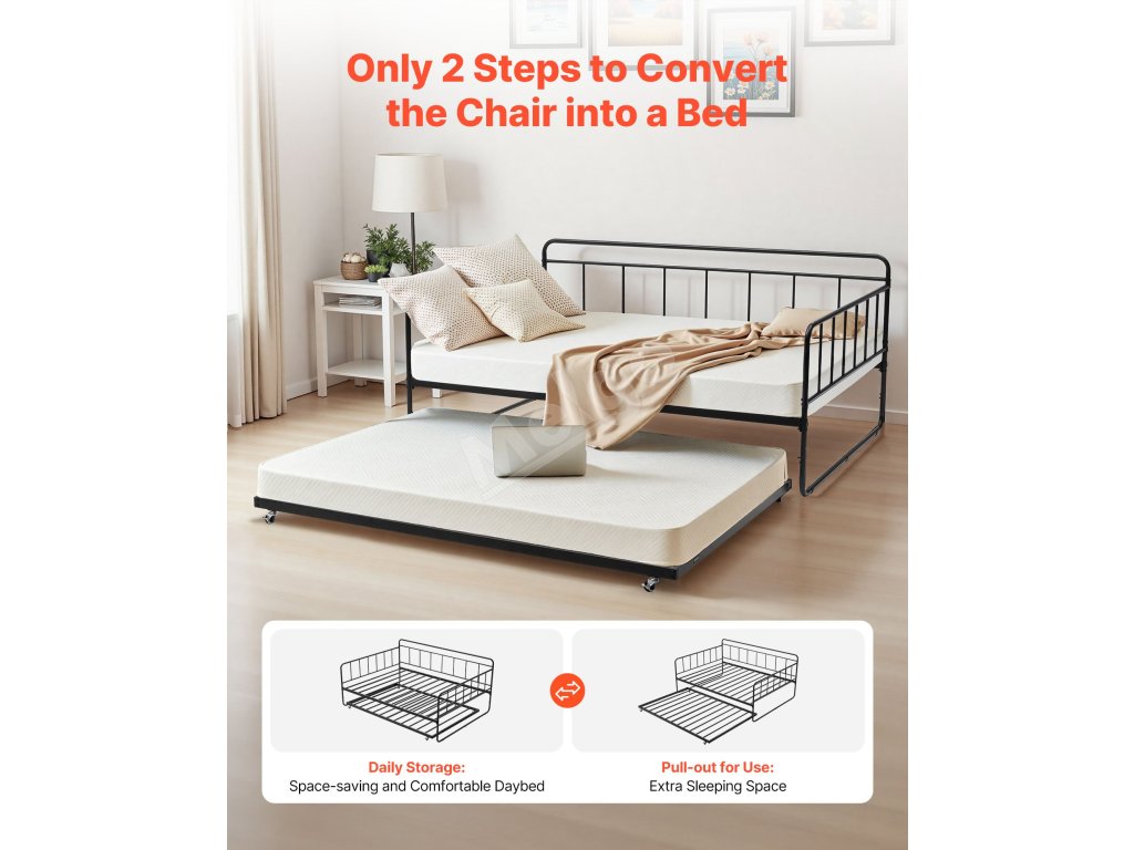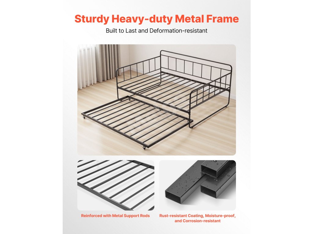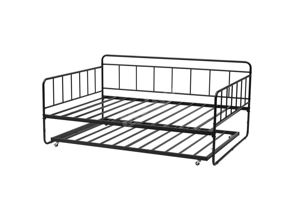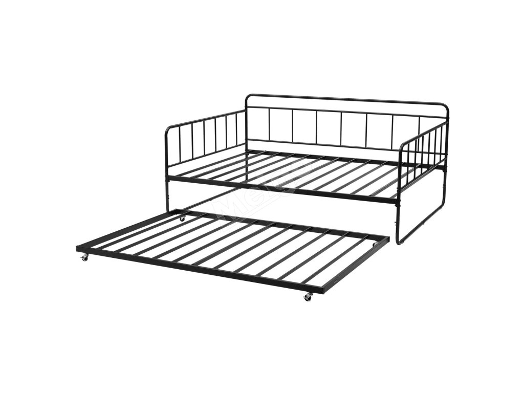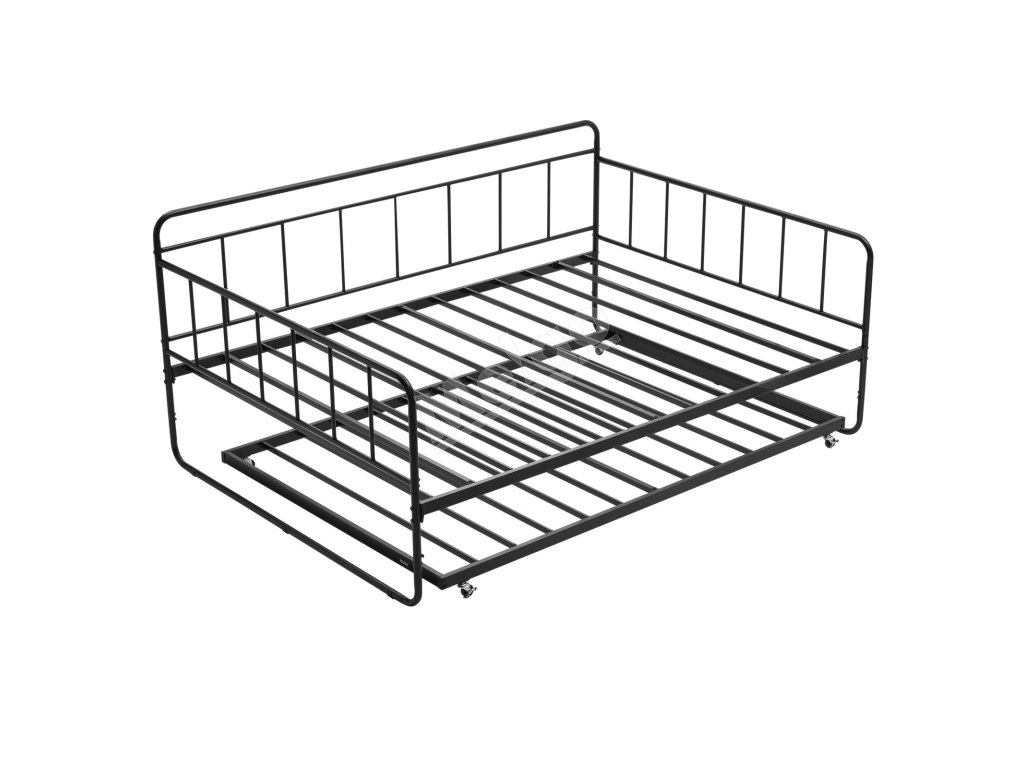 Denná posteľ v plnej veľkosti s výsuvným lôžkom, kovový rám, lamely
