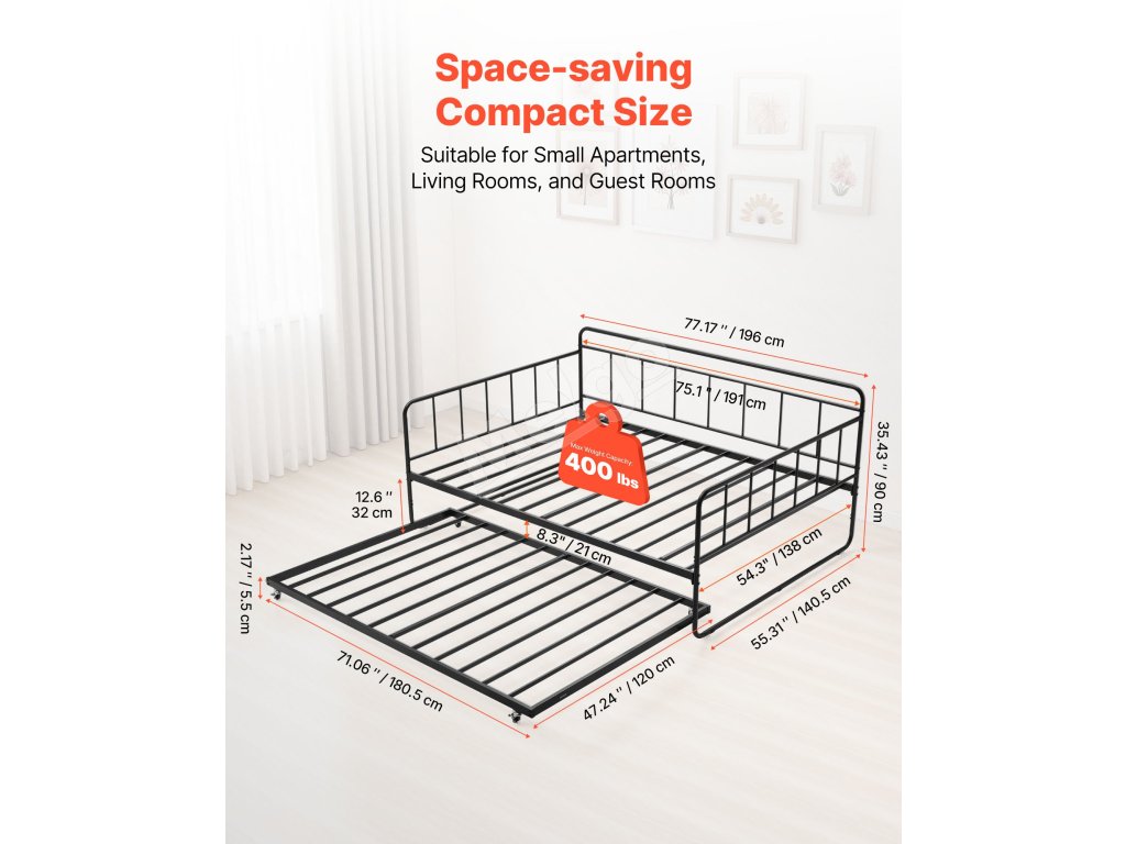 | Denná posteľ | 77.17 x 55,31 x 35,43 palcov / 196 x 140,5 x 90 cm |