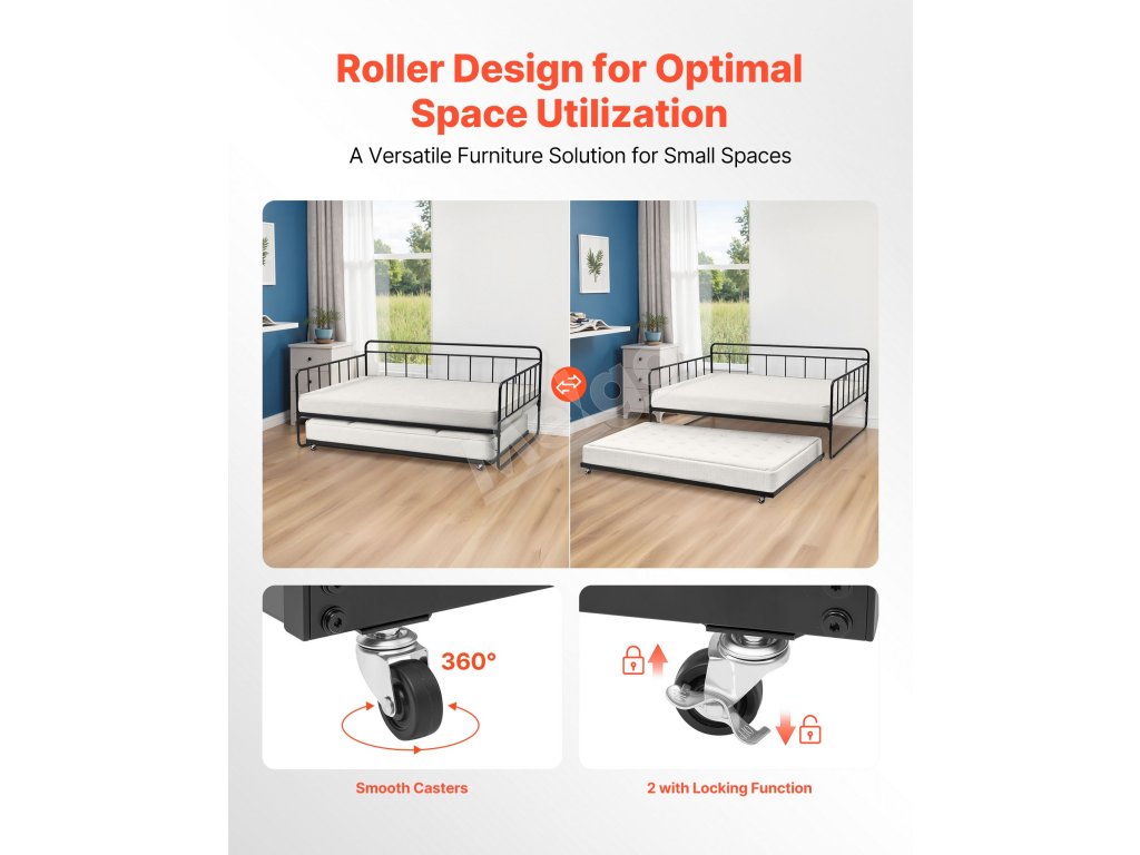 Posteľ je vybavená 2 hladko sa otáčajúcimi kolieskami a 2 uzamykateľnými kolieskami, vďaka čomu ju môžete jednoducho vysunúť a premeniť na plnohodnotnú posteľ a jednolôžko. Stačí umiestniť matrac a zažiť pohodlný spánok.