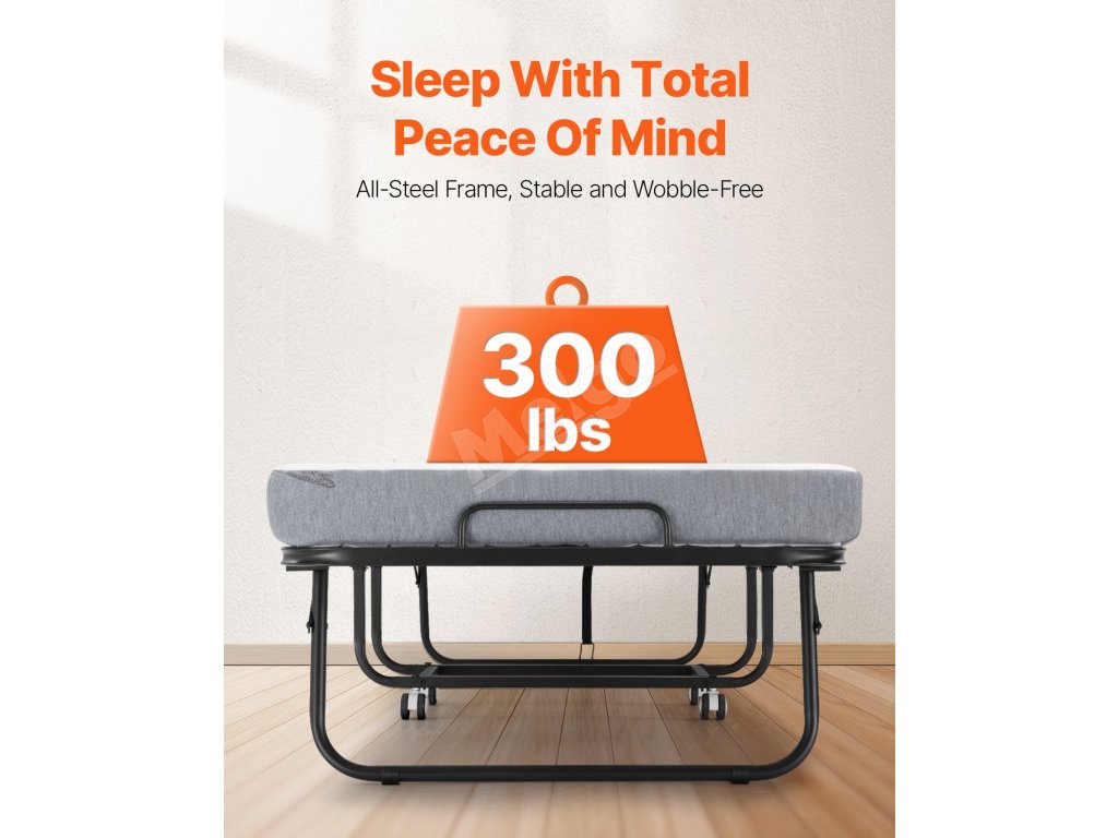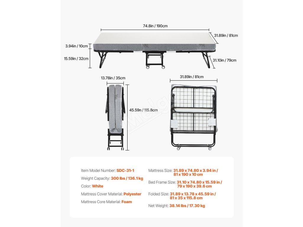 Skladacia posteľ na kolieskach 31 in×75 in, 4 in matrac, kovový rám
