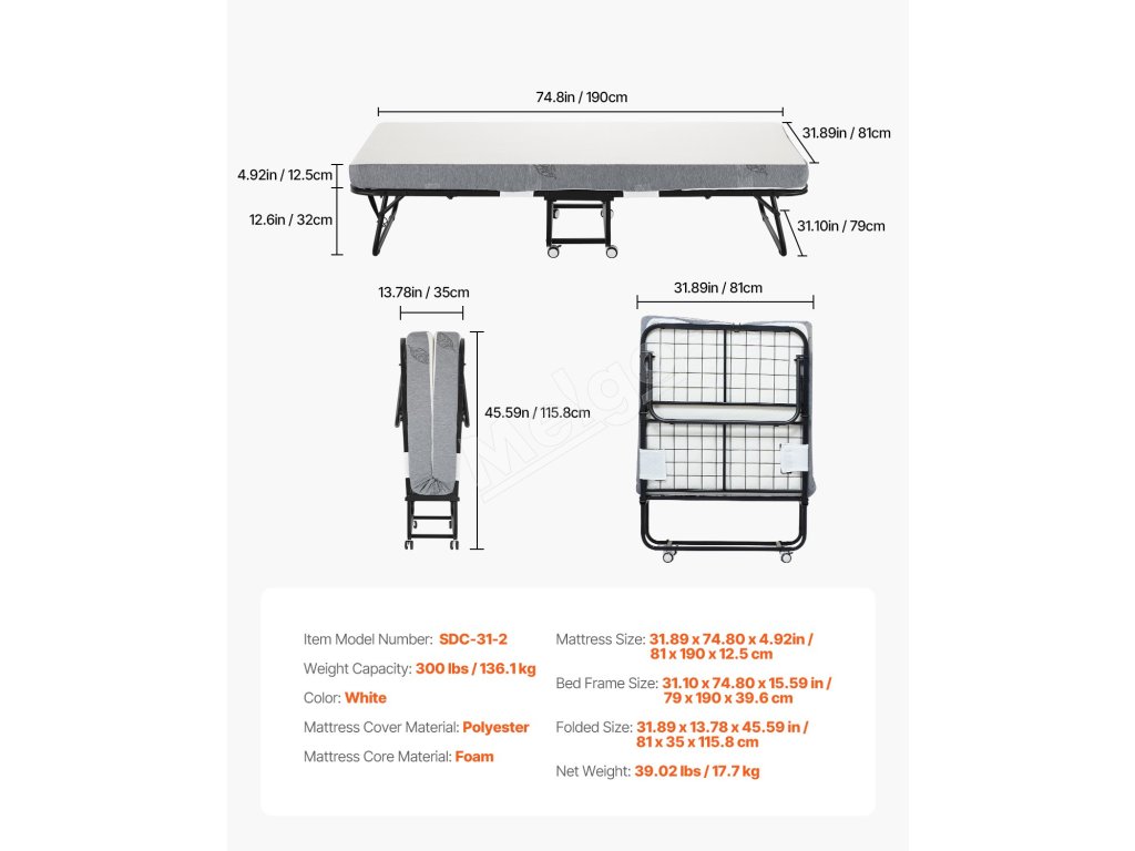 Skladacie lôžko 31 in × 75 in, 5 in matrac, pamäťová pena, kovový rám