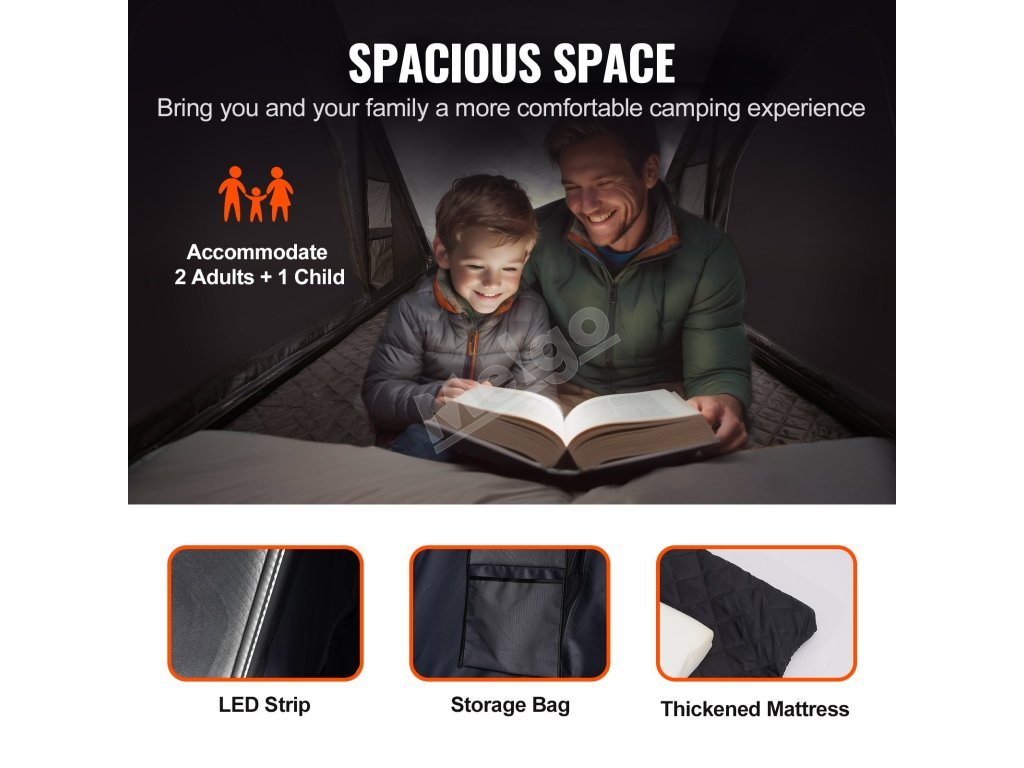 Tento strešný stan je určený pre rodiny, ktoré milujú dobrodružstvá v prírode. Ponúka priestranný priestor, do ktorého sa zmestia 2 dospelí a 1 dieťa, s dverami a oknami, ktoré poskytujú rozsiahly výhľad a umožňujú vám naplno si vychutnať skvelý výlet. Odolný stan vydrží mnoho ďalších dobrodružstiev.