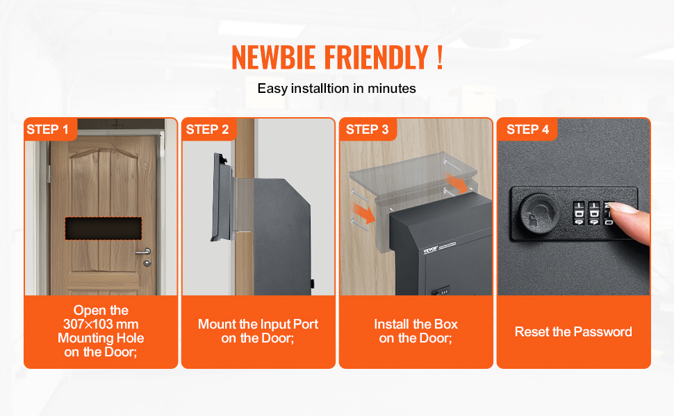 Naša konštrukcia schránky na vhadzovanie kľúčov zohľadňuje každý detail, vďaka čomu je inštalácia jednoduchá. Stačí označiť a otvoriť inštalačné otvory na stene, namontovať otvory na doručovanie na dvere, vložiť poštovú schránku do dverí a nainštalovať ju. Nakoniec resetujte heslo a vaša poštová schránka je pripravená na použitie!