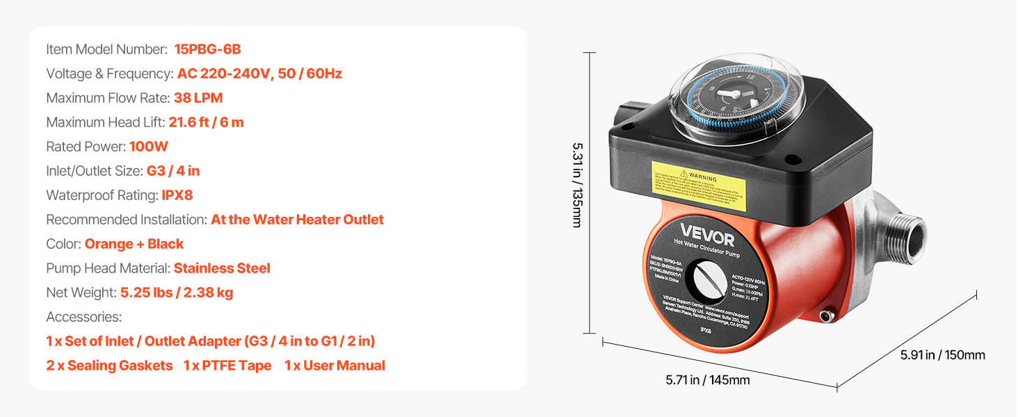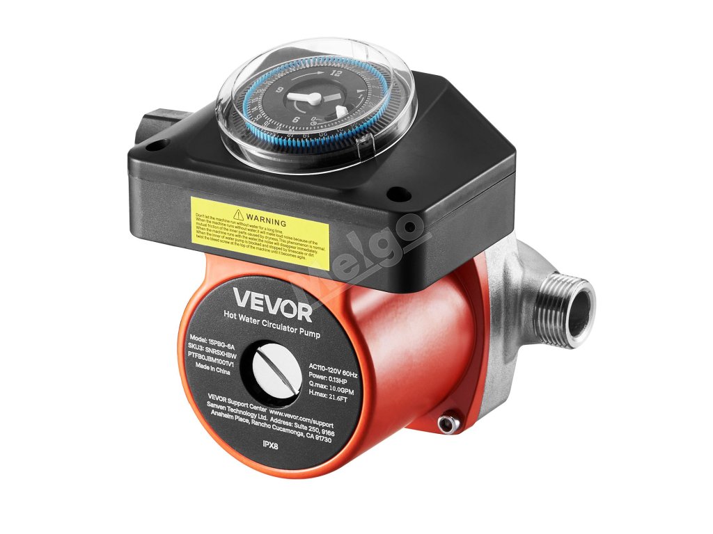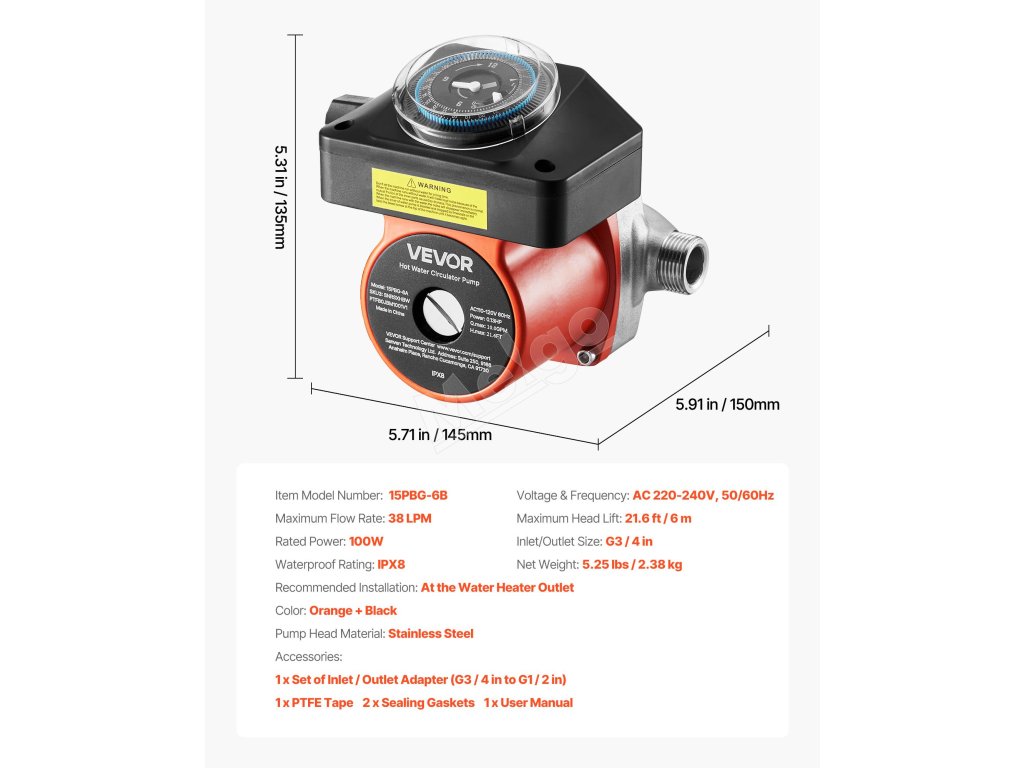 Obehové čerpadlo teplej vody, časovač, 38 LPM, 220-240V, G3/4in→G1/2in