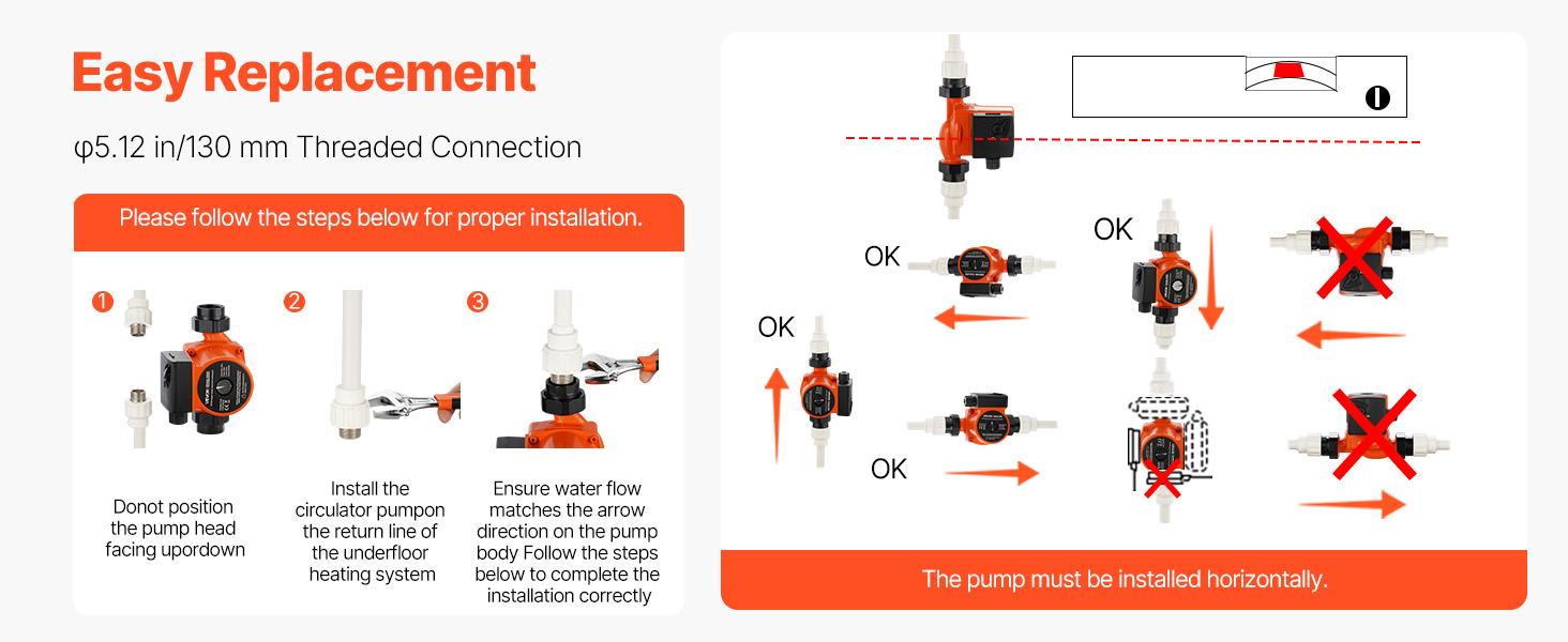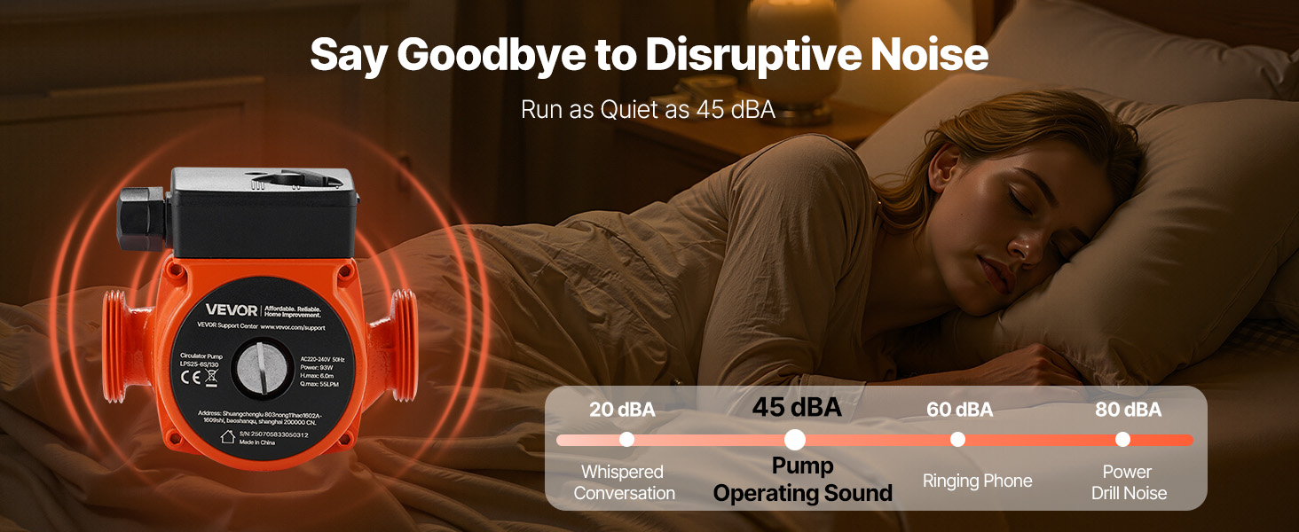 Toto obehové čerpadlo teplej vody dosahuje vynikajúce výsledky v oblasti regulácie hluku, pričom jeho prevádzkový hluk je 45 dBA. Nebude rušiť váš každodenný život ani pracovné prostredie, zabráni nepríjemným pocitom spôsobeným hlukom a zároveň zabezpečí plynulý a tichý chod systému cirkulácie teplej vody.