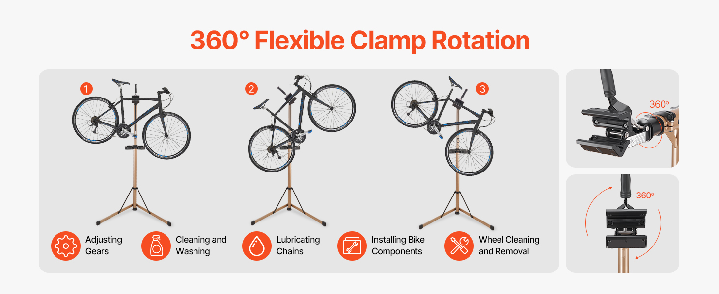 Stojan na opravu bicyklov je vybavený 360° otočnou svorkou, ktorá zabezpečuje pohodlnú polohu rúk pri práci na rôznych častiach bicykla.