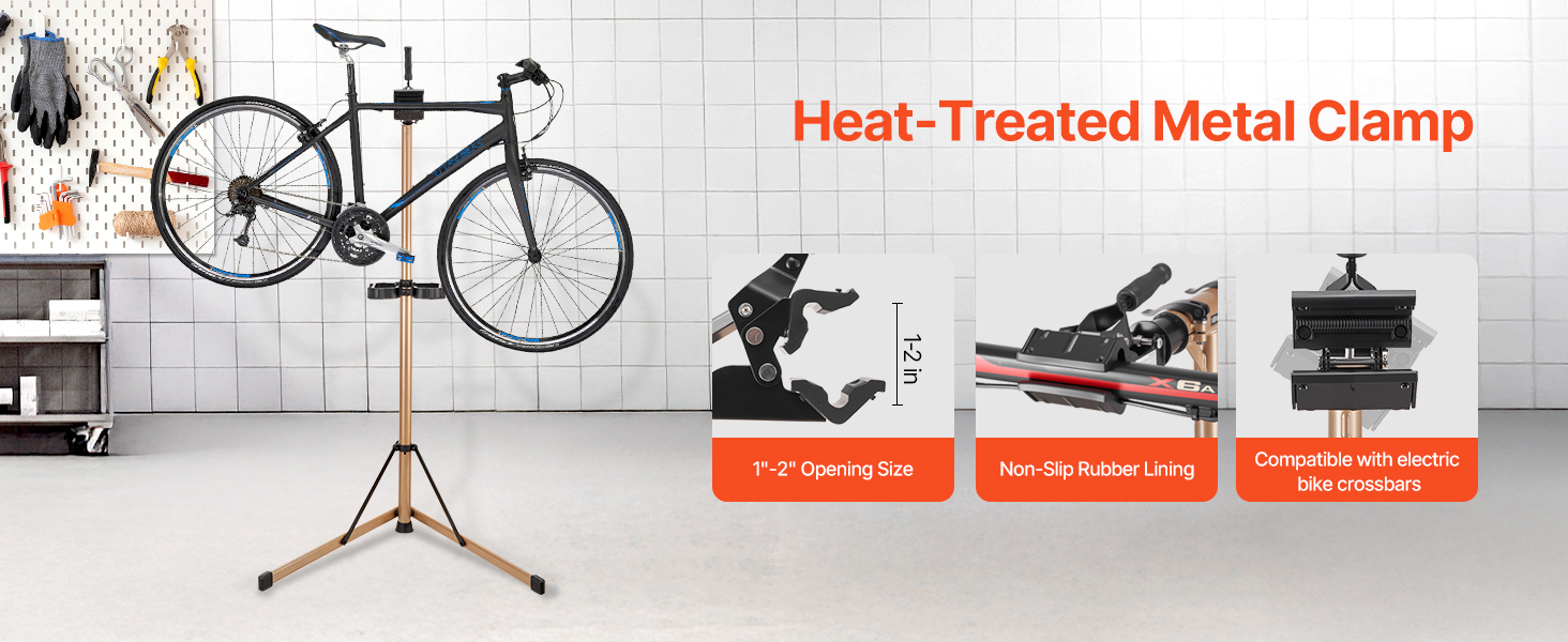 Pracovný stojan na bicykel ponúka nastaviteľnú svorku s mäkkou gumovou výstelkou, vďaka ktorej bezpečne udrží rúrky bicykla rôznych priemerov. Robustné materiály sú skonštruované tak, aby odolali rozbitiu a deformácii.